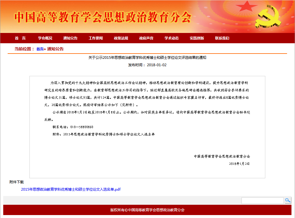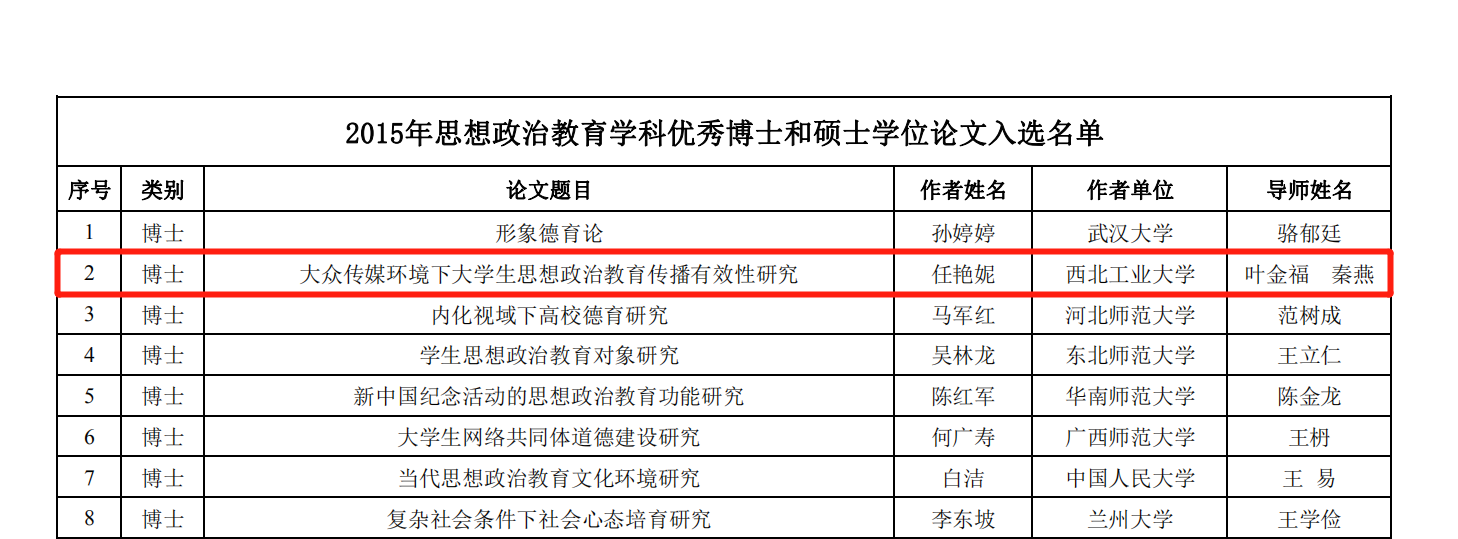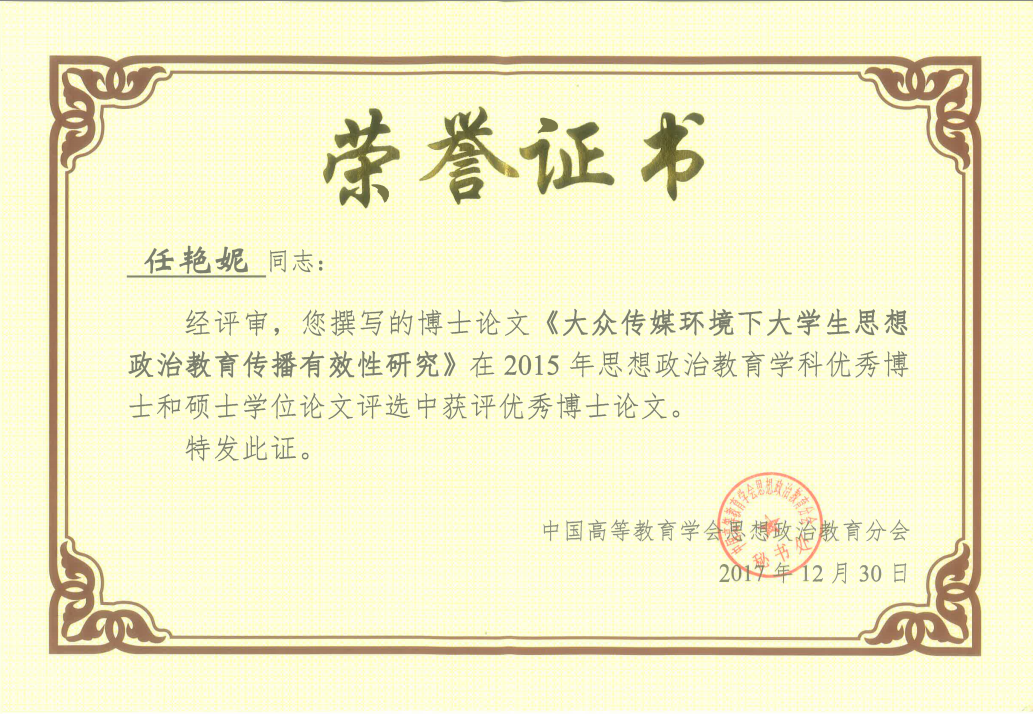 中国高等教育学会思想政治教育分会于2016年11月开展针对2015届全国思想政治教育学科优秀博士学位论文评选工作,评选结果于近期公布,公司思想政治教育专业博士生任艳妮撰写的博士论文《大众传媒环境下老员工思想政治教育传播有效性研究》成功入选。本次评选工作是为深入贯彻党的十九大精神和全国高校思想政治工作会议精神,推动思想政治教育理论创新和团队建设,提升思想政治教育学科研究生的培养质量和创新能力。在教育部思想政治工作司的指导下,经过部直属高校及各地思想政治教育研究分会遴选推荐、中国高等教育学会思想政治教育分会组织专家匿名评审,历时一年半的时间,最终从符合参评要求的31篇论文中评选出8篇优秀博士论文。