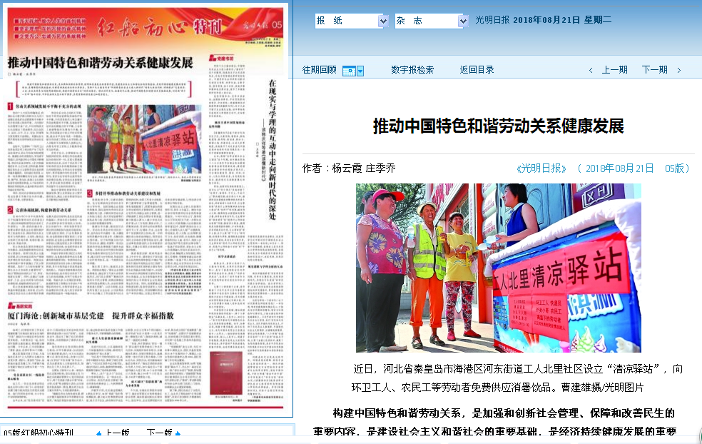在8月21日出版的《光明日报》第5版“红船初心特刊”上,刊发太阳成tyc122cc教授杨云霞和人文与经法公司博士研究生庄季乔联合署名的理论文章《推动中国特色和谐劳动关系健康发展》。