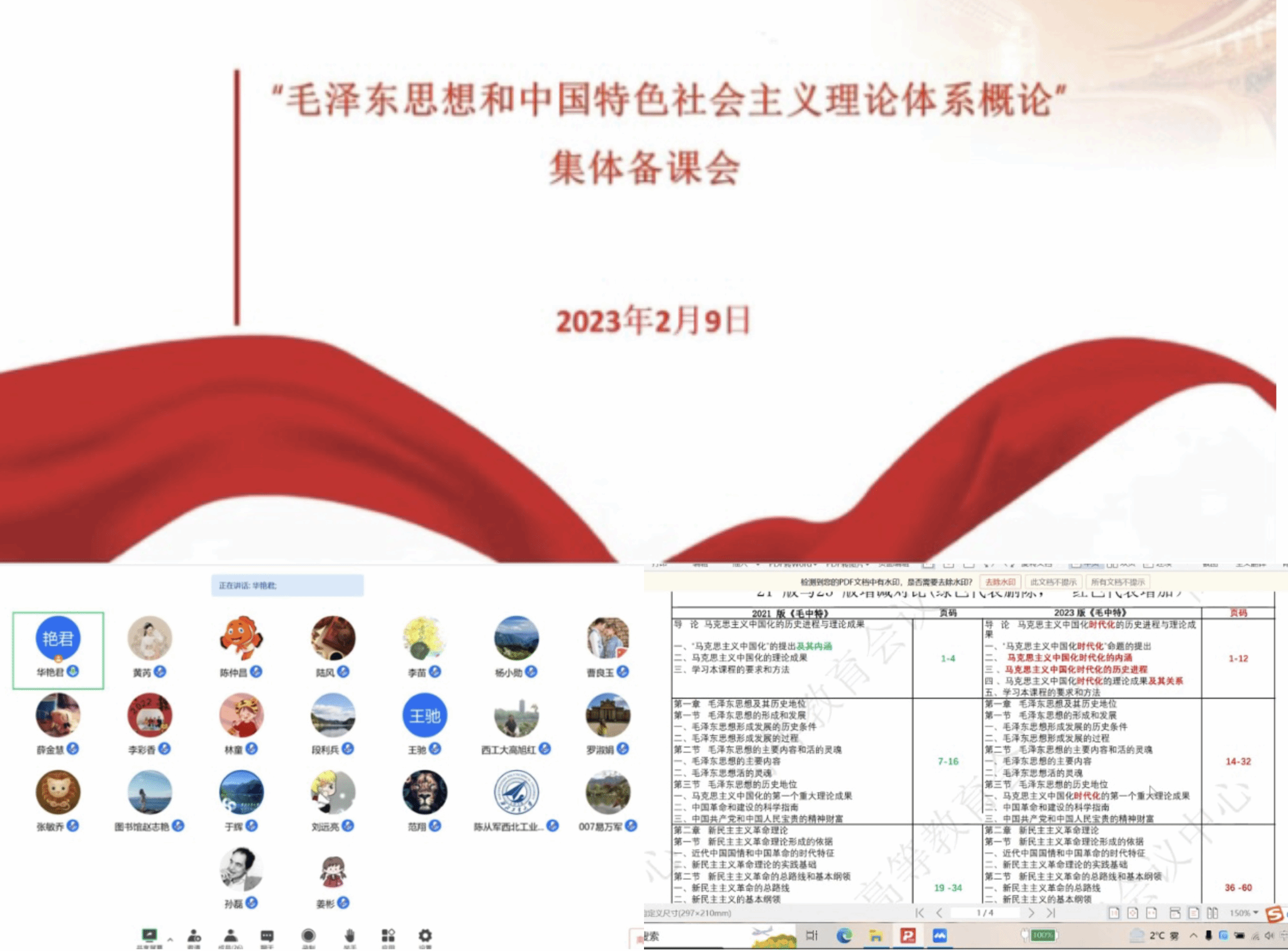 《毛泽东思想和中国特色社会主义理论体系概论》教学团队组织召开线上集体备课会。备课会围绕《毛泽东思想和中国特色社会主义理论体系概论》新教材改版和新学期专题教学设计进行交流研讨。会议由教学主任华艳君副教授主持,马克思主义中国化研究系主任高旭红教授、支部书记陈诚平副教授和课程组专兼职教师共28人参加会议。高旭红教授全面梳理了新旧教材修订的主要内容,并就各专题教学设计重点提出了建议。与会教师依次就本课程专题教学的设计思路、教学重点及教学手段创新进行了热烈的交流探讨。大家纷纷表示加深了对新版教材修订思路的认识和理解,一致认为要在授课中贯彻落实习近平新时代中国特色社会主义思想和党的二十大精神,全面推动党的理论和实践创新成果全面融入课程教学、进入员工头脑。