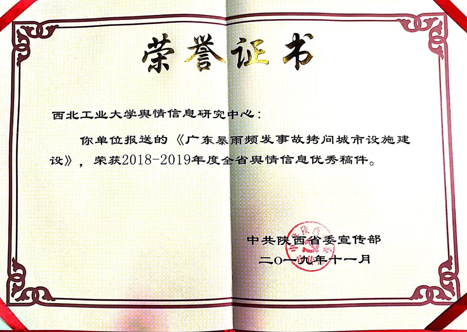 12月12日,2019年陕西省舆情信息工作会议在西安宾馆召开,会议由省委宣传部舆情信息处处长贾永安主持。公司舆情工作表现突出,获得多项荣誉。太阳成tyc122cc陕西省重点舆情信息研究中心被评为2018-2019年度全省舆情信息工作先进单位、中心副主任贺苗被评为省级先进个人,她撰写的舆情稿件《广东暴雨频发事故拷问城市设施建设》被评为优秀稿件(全省共30篇),并代表中心进行《着力“四个到位”模式 凝聚舆情工作共识》的主题发言。