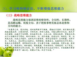 二、在教学实施上,坚持文学、历史、哲学的“三融合”。马克思主义哲学是马克思主义的理论基础,哲学本身具有的抽象思辨特性使得员工对马克思主义一些复杂问题较难深入理解。为了便于员工掌握,李军时老师在沟通对比马克思主义哲学与中国哲学的基础上,发扬中国文化中文学、历史、哲学紧密融合的优良传统,通过具体的历史事件体现抽象的哲学理论,通过文学性的手法活跃课堂,既增强了对员工的吸引力、感染力,又提升了课堂思想文化容量。更为重要的是,以马克思主义为武器,通过对中国几千年社会政治经济文化的分析,促进了员工对中国文化和马克思主义的双向互动理解。在讲授培养科学思维方法一节中,改变对员工进行概念化说教的方法,通过观看电视连续剧《三国演义》三顾茅庐和文言名篇《隆中对》,使员工明白三国期间的历史演化正沿着诸葛亮谋划的蓝图进行,从而深入理解战略思维的巨大作用;从《三国演义》曹操在与袁绍官渡之前犹疑不定中,郭嘉不顾众议提出“十胜十败”之论,帮助员工理解辩证思维。在讲授历史唯物主义部分,通过分析盛唐时期边塞诗宏大的境界、豪迈的情调与安史之乱后大历诗派清冷的诗风、萧瑟的情境,引导员工理解社会存在决定社会意识,社会意识反映社会存在。