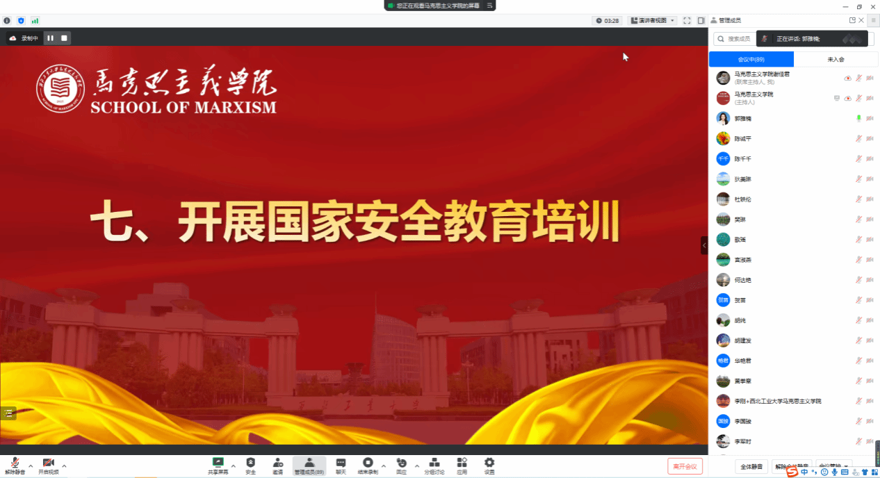 公司办公室主任郭雅楠做国家安全教育培训,传达了今年国家安全教育的主题“贯彻总体国家安全观,增强全民国家安全意识和素养,夯实以新安全格局保障新发展格局的社会基础”,并组织与会人员共同观看安全教育短片《家国密事》等。