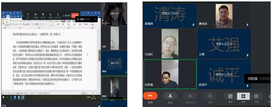 2020年4月25日,西工大“启真明智”第三期读书会在钉钉线上如期举行。此次读书会由博士生艾强主持,公司杨冰郁老师、陈诚平老师以及10多位硕博生共同参加,以《路德维希·费尔巴哈和德国古典哲学的终结》第三章作为研读篇目,展开了交流与讨论。