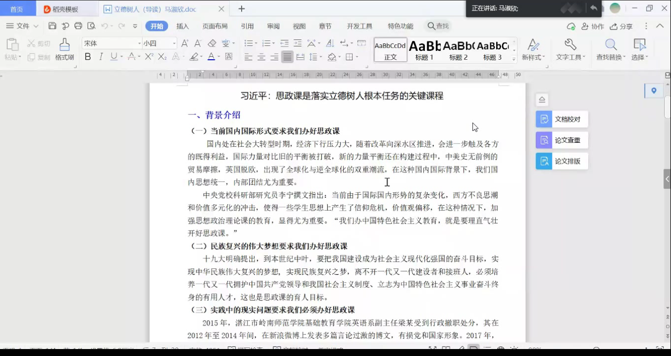 接着,公司硕士生黄清涛和博士生马淑欣作为原著文本导读人,先后就习近平总书记在2019年3月18日全国公司思政课教师座谈会上的讲话《思政课是落实立德树人根本任务的关键课程》进行了内容分析,带领大家解读其中的要点和难点。从讲话的背景介绍、内容概要、相关研究的拓展这些大方面,到立什么德、树什么人、思政课教师的“六个要”和思政课改革创新的“八个统一”这些具体方面,他们细致的导读让大家受益颇深。