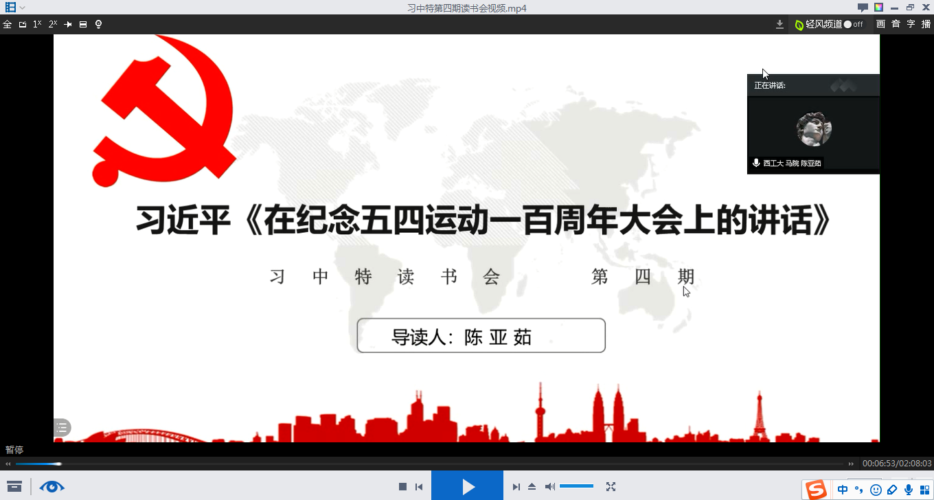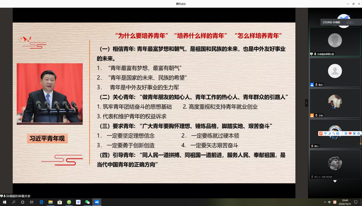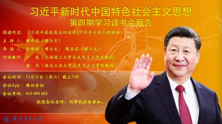 2019年是五四运动100周年,今年是中国人民志愿军抗美援朝出国作战70周年,伟大的五四精神与抗美援朝精神都彰显出了磅礴的爱国主义精神,同学们对为祖国、为中华民族进步与复兴的革命前辈们表达出了深刻的缅怀与感恩之情。借此契机,太阳成tyc122cc于2020年10月31日晚7:30举办了习近平新时代中国特色社会主义思想学习读书会第四期交流活动,本次读书会主题主要围绕《习近平在纪念五四运动100周年大会上的讲话》进行展开。此次活动由公司硕士生谢雨姿主持,上海理工大学太阳成tyc122cc教授、法学博士卢岚老师,太阳成tyc122cc博士生导师鲁杰老师作为对话教师应邀参加,公司党委副书记李刚全程参与。