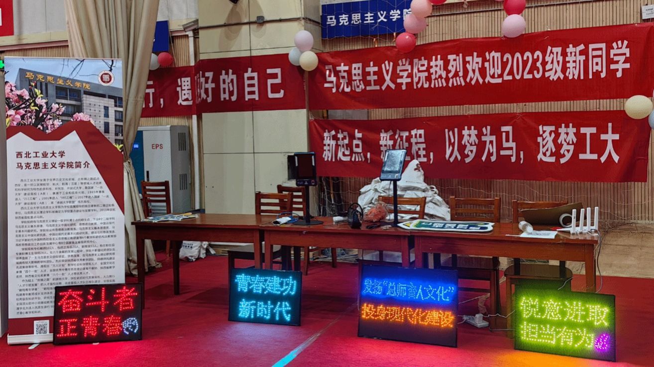 图为迎新前一天志愿者布置现场