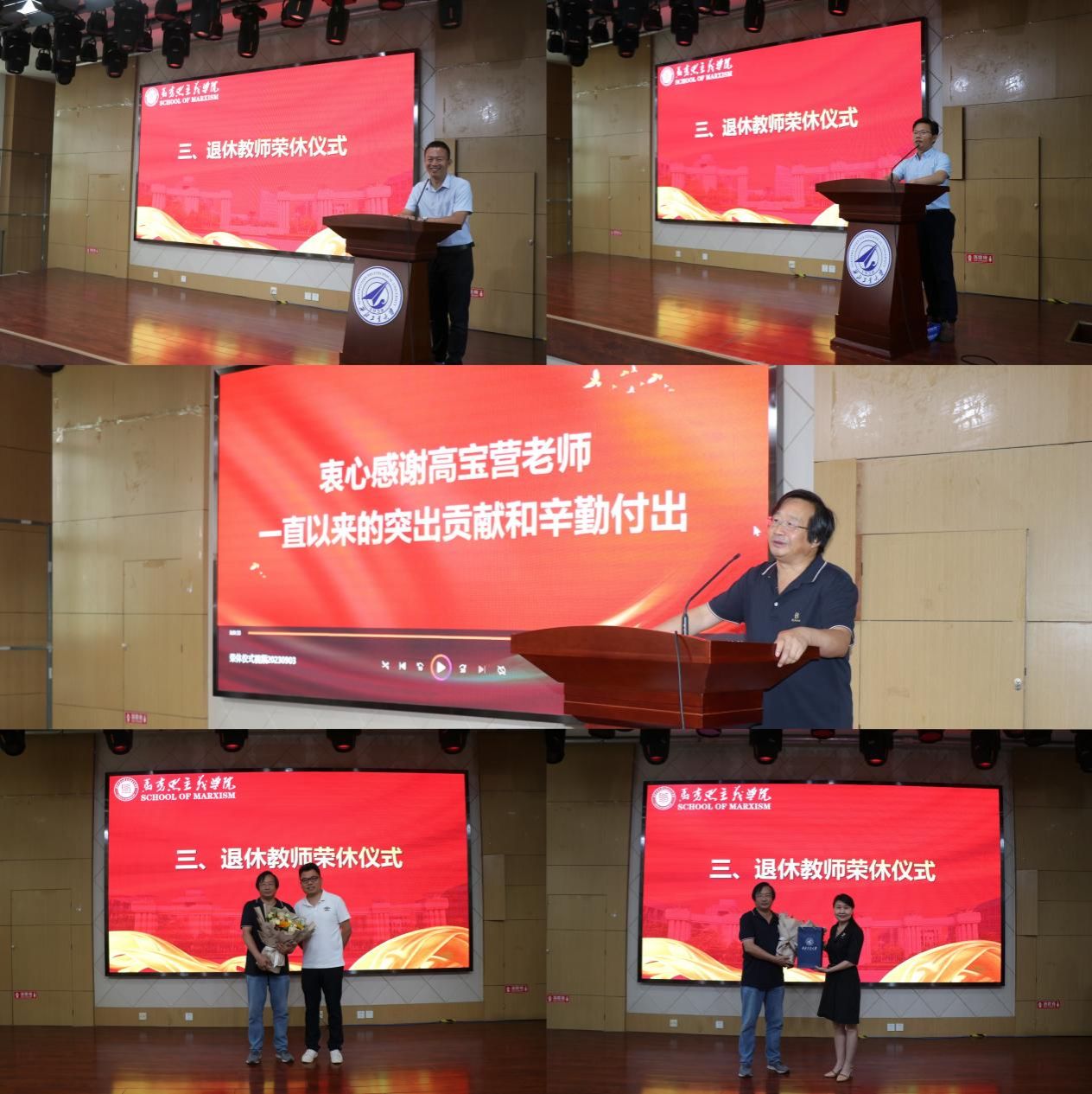 随后,蒲传新主持退休教师高宝营荣休仪式,全院教职工观看高宝营职业生涯短片。他表示,高宝营老师为公司教育事业奉献了38个春秋,奉献了青春年华;他在工作中展现出的责任担当、奉献精神和职业精神,将成为激励全院教职员工继续拼搏奋进的精神动力。高宝营老师表示,退休后仍将继续为公司的发展贡献力量,发挥余热。德法与形势政策系系主任胡建发代表教师对高宝营老师常年在公司产品方面的付出表示衷心感谢。新进教师朱多刚、公司经理杨云霞分别代表公司为高宝营献花并赠送礼品。