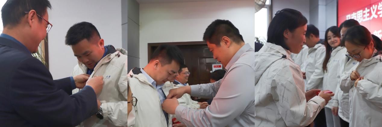 会议最后,公司党委副书记李刚及导师代表张云龙、杨冰郁为同等学力博士新生佩戴院徽并合影留念。