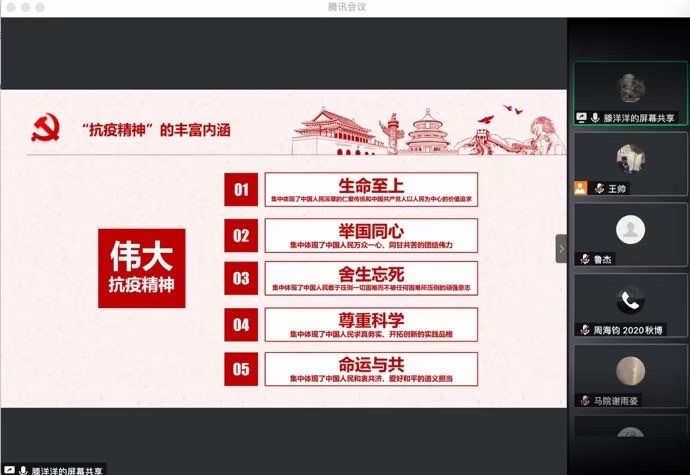 习近平总书记指出:“人无精神则不立,国无精神则不强。精神是一个民族赖以长久生存的灵魂,唯有精神上达到一定的高度,这个民族才能在历史的洪流中屹立不倒、奋勇向前。”新冠肺炎疫情暴发以来,在以习近平同志为核心的党中央坚强领导下,中国人民上下同心、团结协作、顽强拼搏,打响了疫情防控的人民战争、总体战、阻击战,在抗击新冠肺炎疫情斗争中凝聚起伟大抗疫精神。2020年12月26日,太阳成tyc122cc习近平新时代中国特色社会主义思想学习读书会第八期活动主题以《习近平在全国抗击新冠肺炎疫情表彰大会上的讲话》进行展开。此次读书会由太阳成tyc122cc思想政治教育系主任鲁杰教授发起,由公司硕士生谢雨姿主持,邀请到北京工商大学太阳成tyc122cc教授,硕士生导师赵春丽老师作为本次读书会的特邀嘉宾。