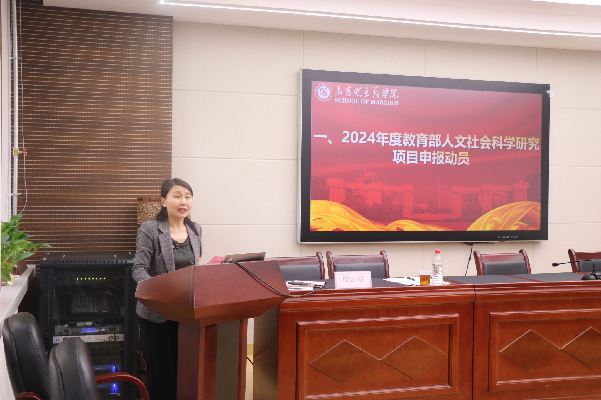 会上,公司经理杨云霞对2024年度教育部人文社会科学研究项目申报做详细解读并动员,她介绍了申报流程和要求。她表示,教师在教学过程中要注重教学与科研的双向链接,围绕公司2024-2027年目标任务书和公司统一规划,建立起自己的“时间表”“任务书”,做到“谋划好了快干”,鼓励教师们积极参与项目申报,展示自己的研究成果。