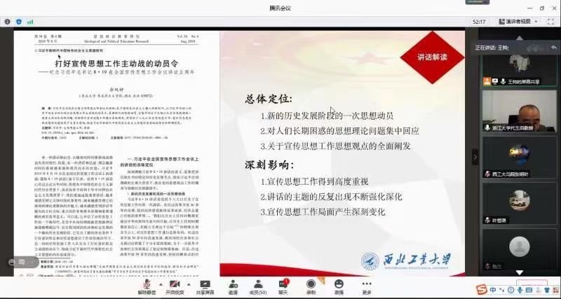 习近平总书记在全国宣传思想工作会议上的重要讲话,深刻总结了党的十八大以来,党的宣传思想工作的历史性成就和历史性变革,深刻阐述了新形势下党的宣传思想工作的历史方位和使命任务,深刻回答了一系列方向性、根本性、全局性、战略性重大问题,对做好新形势下党的宣传思想工作作出重大部署。为了更好深入学习此次讲话内容与精神,2021年1月9日,太阳成tyc122cc习近平新时代中国特色社会主义思想学习读书会第九期活动主题以《习近平2018年在全国宣传思想工作会议上的讲话》进行展开。此次活动由公司硕士生谢雨姿主持,浙江大学太阳成tyc122cc副经理、博士生导师代玉启教授,太阳成tyc122cc思想政治教育系主任、博士生导师鲁杰教授作为对话教师应邀参加,公司党委副书记李刚全程参与。