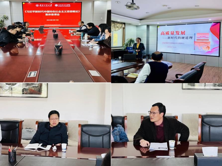 《习近平新时代中国特色社会主义思想概论》课程组于3月19日下午,线下组织召开了“习近平总书记思想政治理论课教师座谈会五周年”主题集体备课会。会议由思想政治教育系副主任宁殿霞主持。首先,由张淑华副教授简要介绍本科评估整改的工作,着重传达了关于“总师育人文化”融入思政课的重要性,并动员各位教师积极参报课程建设项目。接下来,2023年陕西省思政课大练兵“教学标兵”宁殿霞进行教学展示,以“高质量发展——新时代的硬道理”为题从历史维度、理论维度、现实维度分别阐述了为什么要推动高质量发展、什么是高质量发展以及新时代十年高质量发展的成效。接着,近期在公司官网【强师德·铸师魂】专栏推介的吕焰助理教授就思政课比赛方面的创新性,经验等进行分享汇报。他指出,思政课教师应注重在日常教学中提升自己的教学质量,可采取发放问卷的形式进行学情前调,采用图表、数据等方式把教材学理性内容变成员工易接受的方式等。最后,相关思政课教师分别就各自所讲专题分享了自己在备课与讲课过程中的心得感受。
