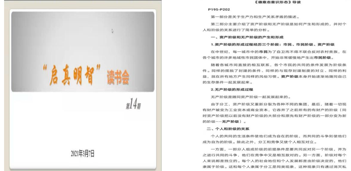 2021年3月7日,西工大“启真明智”第十五期读书会在腾讯会议线上如期举行。此次读书会由硕士生田瑞青主持,公司宁殿霞、杨荣老师以及30余位硕博生共同参加,以《德意志意识形态》第一章IV部分其中一部分作为研读篇目,展开了交流与讨论。