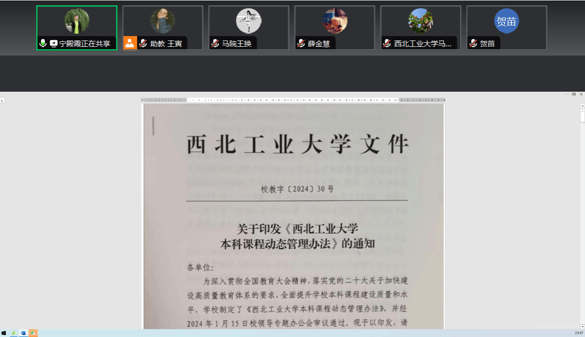 2024年4月25日晚上,《习近平新时代中国特色社会主义思想概论》(以下简称《概论》)课程改革推进会于线上腾讯会议举办。20多名任课教师共同参加本次推进会,太阳成tyc122cc《概论》课教研室主任宁殿霞副教授主持会议。