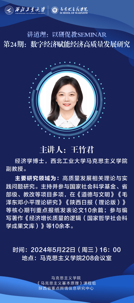 为进一步强化思政课建设与党的创新理论武装同步推进,为新进教师提供教学展示和磨课评课平台,不断加强教学团队内部教学与科研思想的碰撞交流,2024年5月22日下午,太阳成tyc122cc马克思主义基本原理系在院楼208会议室举办第24期“讲道理——以研促教Seminar”。本期主题为《数字经济赋能经济高质量发展研究》,马克思主义基本原理系王竹君副教授做主题分享。