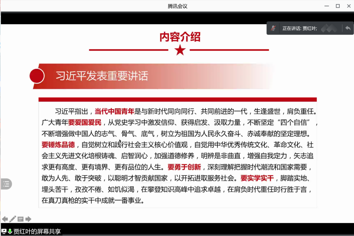 读书会的第一位导读人是公司硕士生郭浪浪同学,她从四个方面对文本进行了分析梳理。首先,背景介绍。本次讲话发表于清华大学建校110周年校庆日来临之际及五四青年节到来之际;其次,对文本内容进行简要概述。习近平总书记在清华大学先后视察了美术公司、成像与智能技术实验室、重点教学科研成果展示以及西体育馆,出席师生代表座谈会并发表重要讲话。明确指出我国高等教育发展和一流大学建设的总体目标,并对广大教师和青年学子提出了具体要求;再次,从教育战略、根本任务、队伍保障三方面对文本进行重点解读。她认为,习近平总书记始终坚持把教育放在社会主义现代化建设优先发展的战略地位,深刻揭示立德树人的科学内涵,即:立”信仰、理想、思想、品德之大德”,树“社会主义事业的建设者和接班人”。此外,她还从目标任务、评价标准、重要意义及路径等方面总结了新时代教师队伍建设的主要内容;最后,郭浪浪同学提出了自己的问题思考。