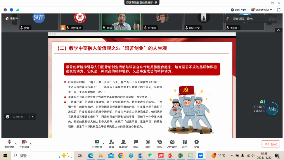 董佳教授围绕“新时代红色精神有机赋能思政课教学研究”这一主题,深入浅出地阐述了新时代红色精神在思政课教学中的重要作用。他结合自己多年的教学研究经验及西工大国防军工院校特色,分享了红色精神如何赋能思政课教学的具体方法和案例,内容详尽、讲述精彩,为与会师生提供了宝贵的研究方向和教学思路。与会师生积极提问交流,结合讲座内容与董佳教授展开了热烈探讨。