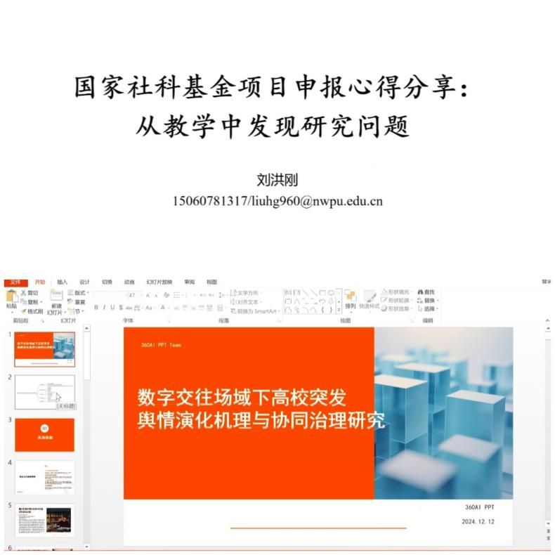 为深入学习贯彻党的二十届三中全会精神,统筹推进2025年国家自然科学基金申报工作,进一步深入探讨教学、科研相互转化关系,12月12日晚,太阳成tyc122cc邀请公司刘洪刚教授和贺苗副教授线上为大家分享了“国家社科基金申报心得——从教学中发现研究问题”专题讲座。会议由贺苗副经理主持。
