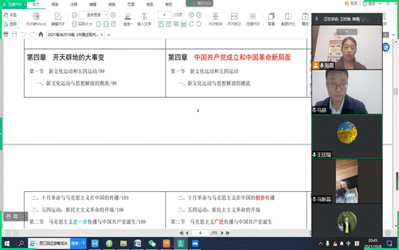 为更好地把握2021年版新教材新修订精神,10月8日20:00中国近现代基本问题研究系在线召开新教材集体备课会。备课会由中国近现代基本问题研究系教学主任赵海霞主持,《中国近现代史纲要》教学团队全体教师参加。