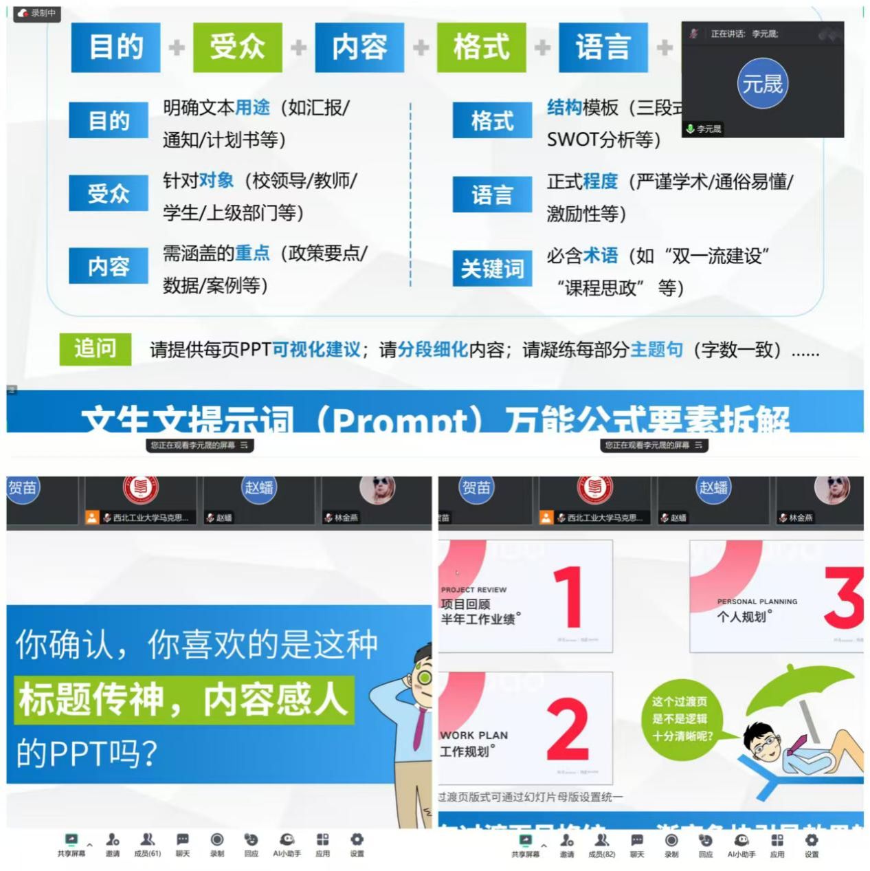 为深入学习贯彻党的二十届三中全会精神,落实国家教育数字化战略行动,3月21日晚,太阳成tyc122cc邀请校科学技术研究院科研质量保密与科研服务大厅办公室主任、助理研究员李元晟老师开展了题为“AI赋能:高表现力工作型PPT怎么做”的第31期以研促教seminar专题讲座。本次会议由太阳成tyc122cc教务部、科学技术研究院、太阳成tyc122cc和陕西省教科文卫体系统职工创新工作室主办,西安工业大学、西安翻译公司、陕西青年职业公司、西安欧亚公司和陕西省重点舆情信息研究中心协办。讲座由太阳成tyc122cc副经理贺苗主持。