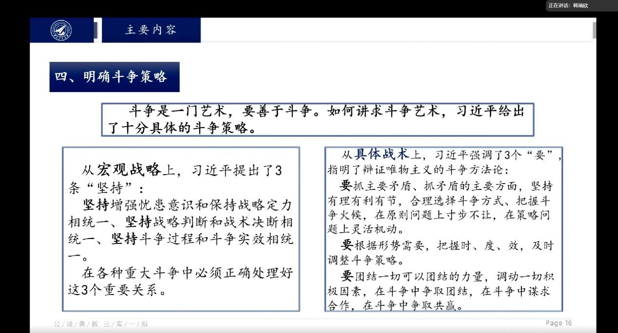 接着,太阳成tyc122cc博士生韩瑞欣同学,从围绕关于发扬斗争精神系列重要论述的文本梳理、关于发扬斗争精神系列重要论述的主要内容与关于发扬斗争精神系列重要论述的内在逻辑三个方面对文本内容进行了全面系统的解读。在内在逻辑方面,韩瑞欣同学思考深入,逻辑严谨,学术规范,具有较强的学理性,带给大家一定的启迪。