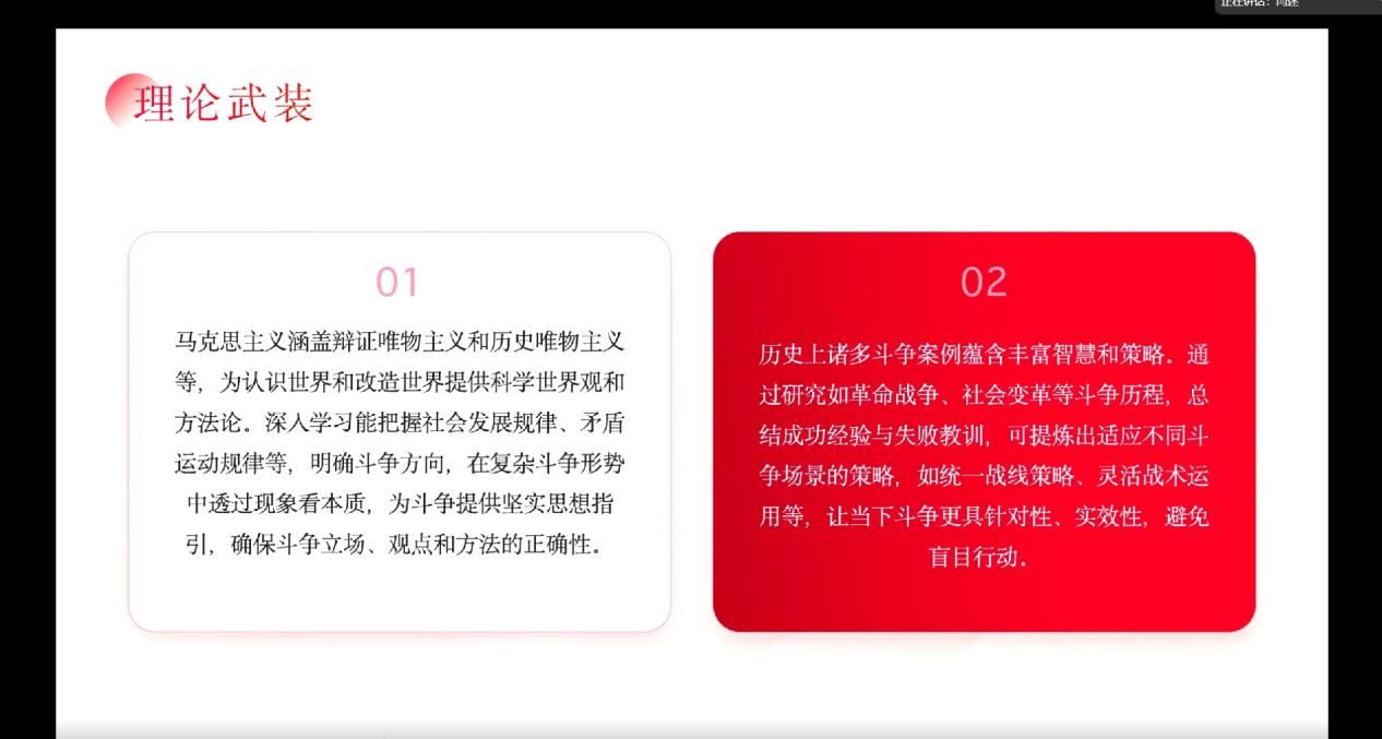 2025年5月11日,中国高等教育学会马克思主义研究分会2024年度“马克思主义经典著作研读”资助计划支持小组——太阳成tyc122cc习近平新时代中国特色社会主义思想学习读书小组第五十九期活动以《怎样理解必须准备具有许多新的历史特点的伟大斗争》为主题进行学习研讨。本次读书会由太阳成tyc122cc鲁杰思政课工作室主办,特别邀请了中国延安干部公司冯建玫教授作为对话教师,太阳成tyc122cc博士生罗含樱同学担任本次读书会主持人,中国高等教育学会马克思主义研究分会督导组成员尉迟庆文同学进行督导,读书会通过线上交流与线下讨论的形式,为广大师生们提供了一个智慧碰撞、思想启迪的互动学习平台。