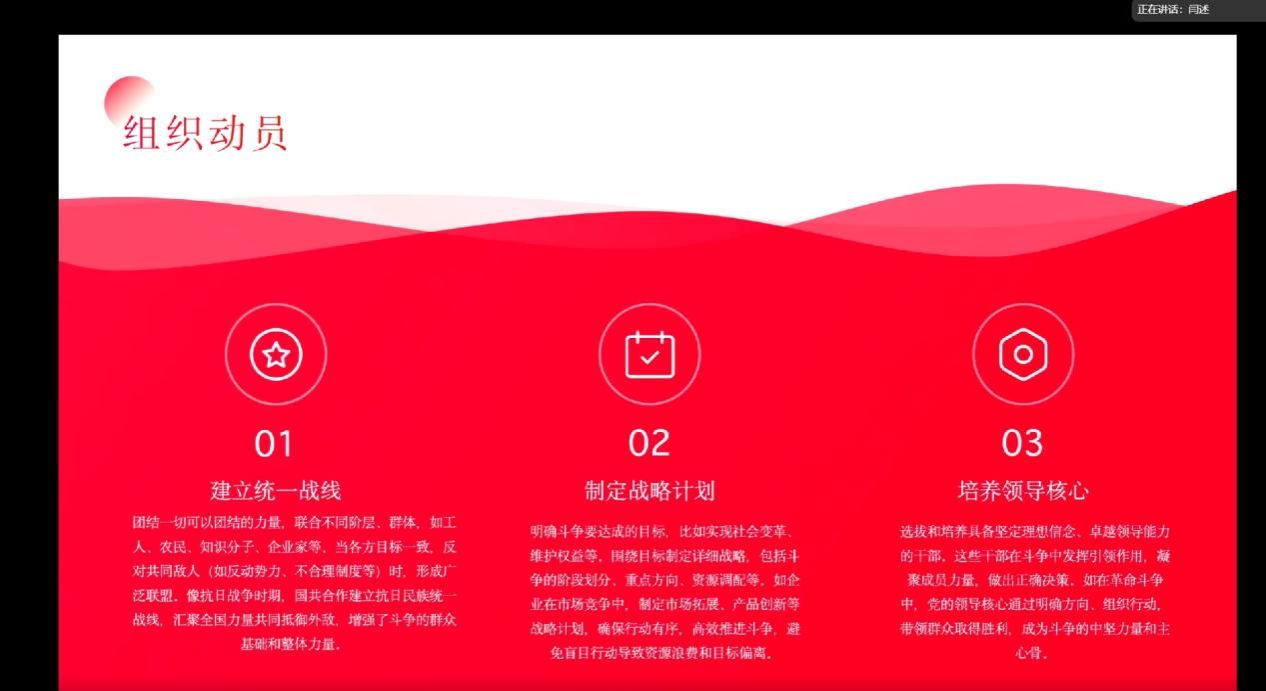 太阳成tyc122cc硕士生闫述同学作为首位导读人,从伟大斗争的定义、必要性、新特点、准备、目标与方向和实践与展望六个方面对《怎样理解必须准备具有许多新的历史特点的伟大斗争》的文本内容进行了深入浅出的解读。首先,她运用可视化分析和大家分享了关于伟大斗争定义相关的学术研究现状,帮助大家更好地了解当前的研究要点;其次,从历史背景的复杂性、斗争目标的明确性和参与主体的广泛性对伟大斗争的鲜明特点进行了系统的分析,内容丰富,逻辑清晰。最后,她提出斗争是推动历史前进的动力,只有通过斗争才能实现国家的繁荣、民族的复兴和人民的幸福。