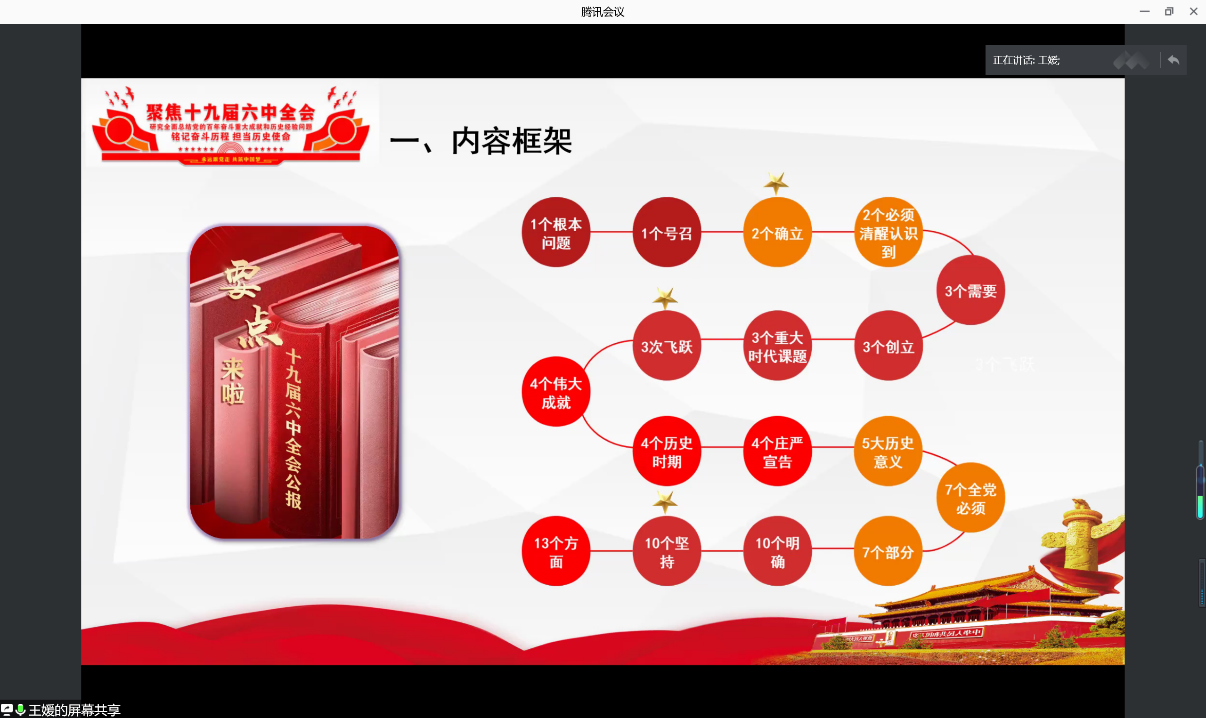 接下来,由公司博士生王媛同学进行导读。内容共分为三大部分进行阐释分析。第一部分,内容框架。以数字为线索清晰的列出了整个决议的总体内容,分别是1个根本问题、1个号召、2个确立、2个必须清醒认识到、3个需要、3个创立、3个重大时代课题、4个历史时期、4个伟大成就、4个庄严宣告、5大历史意义、7个全党必须、7个部分、10个明确、10个坚持、13个方面。第二部分,专题分析。专题一:“两个确立”的重要意义。“两个确立”是马克思主义的内在属性、“两个确立”是中国共产党的宝贵经验、巩固党的十八大以来取得的伟大成就、新时代党和国家事业发展、推进中华民族伟大复兴历史进程的现实需要、彰显了人民性、历史性和时代性的高度统一。专题二:马克思主义中国化的“第三次”飞跃。习近平新时代中国特色社会主义思想是当代中国马克思主义、二十一世纪马克思主义,是中华文化和中国精神的时代精华,实现了马克思主义中国化新的飞跃。专题三:十个坚持”的科学内涵与逻辑关系。为什么要提“坚持”?“坚持”既是底线思维的体现,也象征着战略定力,就是要绵绵发力、久久为功。为什么要提“十个坚持”?是因为这十个方面是具有根本性和长远指导意义的十条历史经验。第三部分,学习心得。在学习过程中要一字一句学、结合起来学、带着信仰学、带着问题学,也为今后同学们深入学习带来思考。