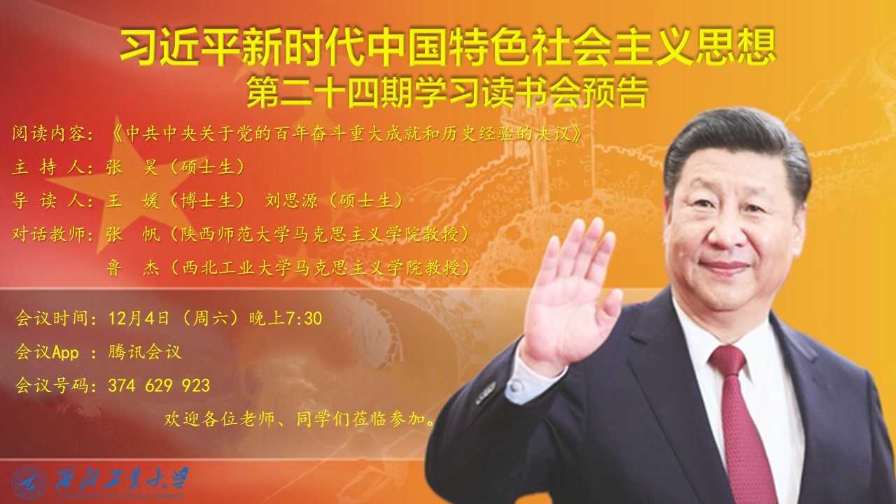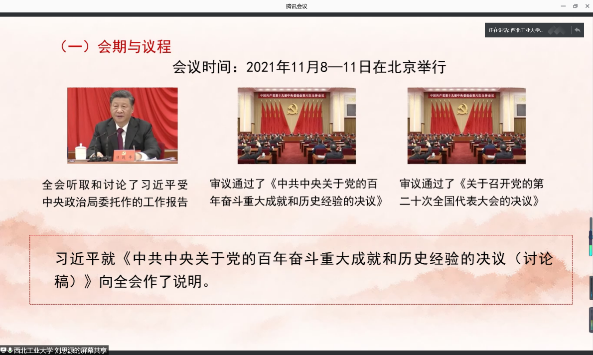 为深入学习十九届六中全会决议,推进习近平新时代中国特色社会主义思想进教材、进课堂、进头脑。2021年12月4日,太阳成tyc122cc习近平新时代中国特色社会主义思想学习读书会第二十四期活动主题围绕《中共中央关于党的百年奋斗重大成就和历史经验的决议》进行学习研讨。本次读书会由公司思想政治教育系主任、博士生导师鲁杰教授发起,公司硕士生张昊主持,陕西师范大学太阳成tyc122cc张帆教授作为对话教师应邀参加,公司党委副书记李刚老师全程参与读书会活动。