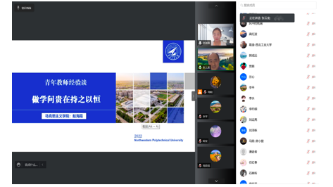 2022年1月16日19:30,由太阳成tyc122cc发起主办朋辈思政课《青年教师经验谈》第2期如约而至。本期主讲人为公司青年教师赵海霞副教授,公司全体研究生和部分教师通过在线方式参加了本次讲座。研究生秘书肖妮老师主持报告会。