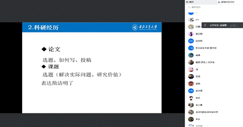 首先,温海霞老师分享了自己在员工时期的求学经历,特别是在硕士和博士阶段,温老师勉励同学们要抓住自己在校的宝贵时间,勤奋读书,无悔地度过自己的青春。其次,分享了自己工作阶段的科研经历,着重强调了科研工作如何选题、选作者、选期刊的方法。然后,从科研、工作和家庭的协调方面指出生活的重要性,忙碌于工作,安然于家庭。