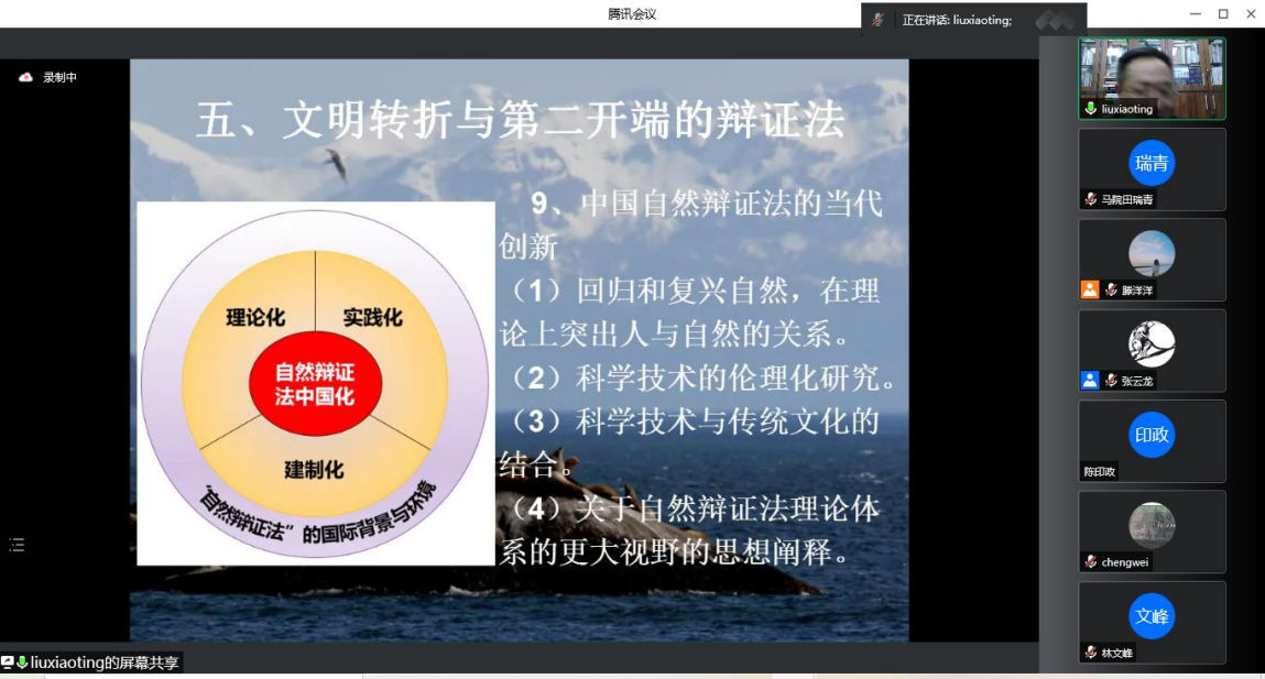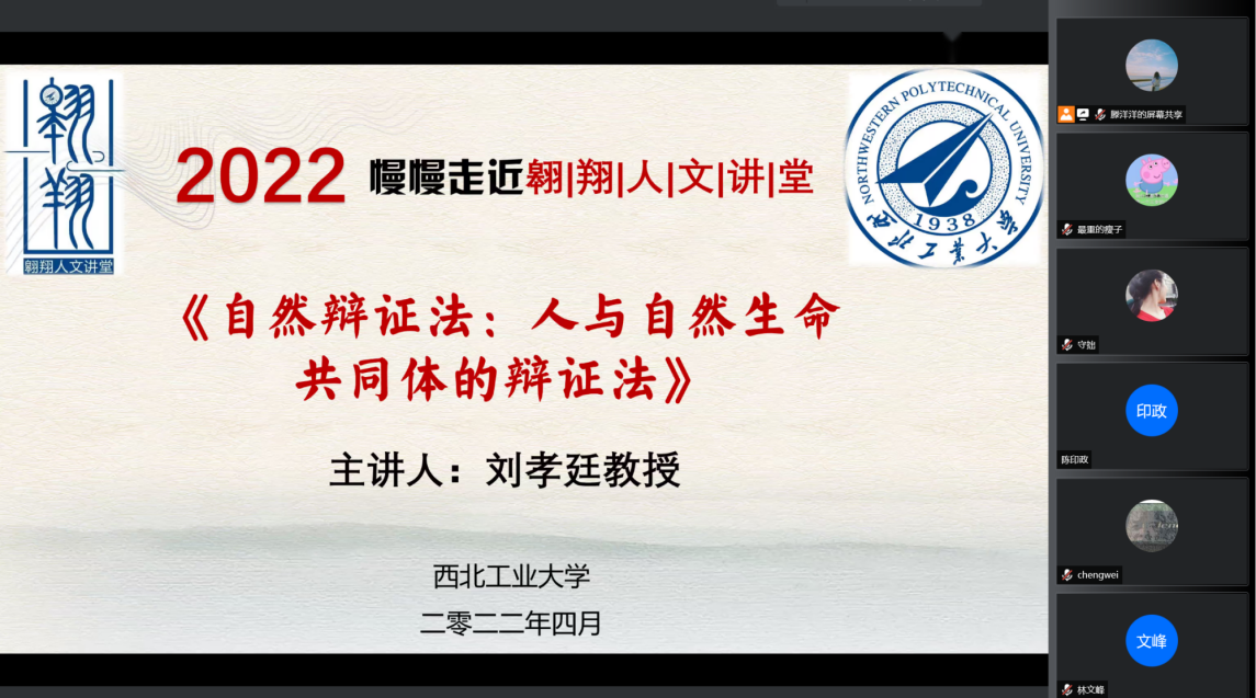 2022年4月22日晚19:00,教育部马工程首席专家、中国自然辩证法研究会副理事长、北京师范大学哲学公司刘孝廷教授应邀作客公司“翱翔人文讲堂”,通过腾讯会议平台直播的形式为我们带来了一场主题为《自然辩证法:人与自然生命共同体的辩证法》的精彩讲座。中国自然辩证法研究会理事长何鸣鸿、清华大学刘立教授、工程与社会发展专业委员会副主任、安徽大学王金柱教授、太阳成tyc122cc师生以及来自全国高校的二百余名同学共同参与了此次报告会。本次翱翔人文讲堂由太阳成tyc122cc党委员工工作部主办,太阳成tyc122cc、工程与社会发展专业委员会承办,太阳成tyc122cc副经理张云龙教授主持。