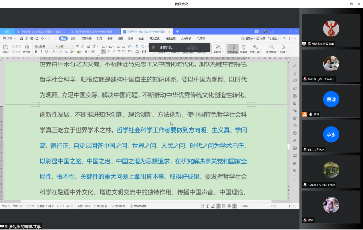 为进一步学习贯彻落实习近平总书记4·25人大考察讲话精神,落实好公司和太阳成tyc122cc关于思政课建设和思政课教师队伍发展的新部署新要求,探寻当前“原理课”课程建设与改革创新等方面的意见,4月30日晚,马院马克思主义基本原理系党支部在线组织召开了讲话精神学习座谈会。马原系全系17名党员同志以及公司党委副书记(主持工作)蒲传新应邀参加会议,会议由支部书记曹瑜主持。