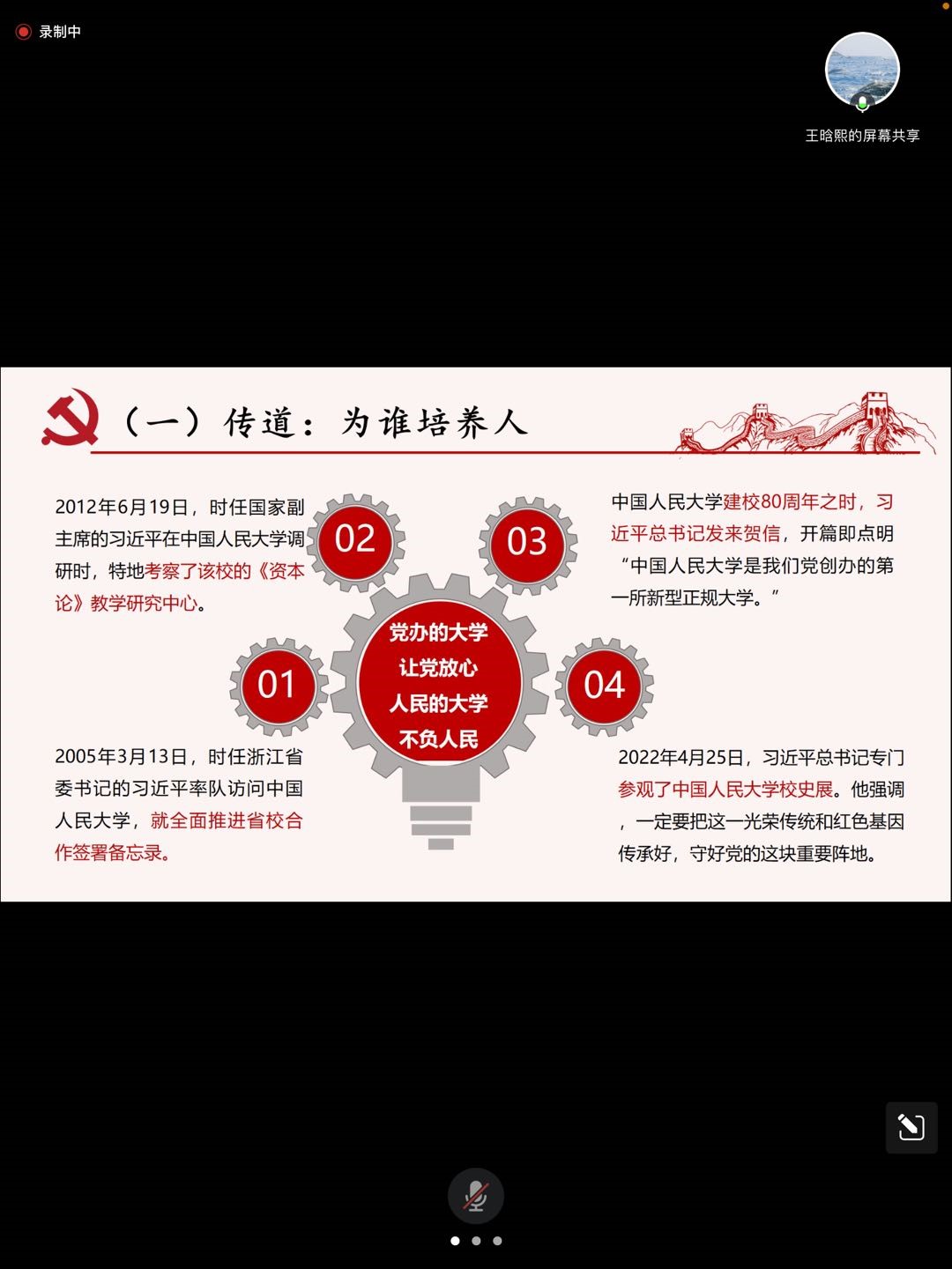 接下来,由公司博士生杨璐静同学进行导读。内容共分为四个部分进行阐释分析。第一部分,坚持立德树人。2022年4月25日上午中共中央总书记、国家主席、中央军委主席习近平来到中国人民大学考察调研。习近平总书记在中国人民大学的讲话中强调:“要坚持党的领导,坚持马克思主义指导地位,坚持为党和人民事业服务,落实立德树人根本任务,传承红色基因,扎根中国大地办大学,走出一条建设中国特色、世界一流大学的新路。”第二部分,传承红色基因。红色基因是一种革命精神的传承。红色,象征光明,凝聚力量和引领未来。瑞金、井冈山、遵义、延安、西柏坡,无一例外因为“红色”而书写了历史。“红色基因”是中国共产党人的精神内核,是中华民族的精神纽带。习近平总书记强调,我国有独特的历史、独特的文化、独特的国情,建设中国特色、世界一流大学不能跟在别人后面依样画葫芦,简单以国外大学作为标准和模式,而是要扎根中国大地,走出一条建设中国特色、世界一流大学的新路。中国人民大学从陕北公学成立之初就鲜明提出要培养“革命的先锋队”,到新中国成立之初提出培养“万千建国干部”,到改革开放新时期提出培养“国民表率、社会栋梁”,再到新时代提出培养“复兴栋梁、强国先锋”,始终不变的是“为党育人、为国育才”,展现了“党办的大学让党放心、人民的大学不负人民”的精神品格。希望中国人民大学落实立德树人根本任务,传承红色基因,让听党话、跟党走的信念成为人大师生的自觉追求。第三部分,推动教育发展。用六个“办好”揭示了推动教育发展的关键要义。办好高校,首先要有一支优秀教师队伍;办好高校,一定要重点办好思政课;办好高校,一定要注重传承;办好高校,不仅要注重自然科学和科学技术的教育,而且要同样重视哲学社会科学的教育和发展;办好高校,要发挥哲学社会科学在融通中外文化、增进文明交流中的独特作用;办好高校,要求青年员工做社会主义核心价值观的坚定信仰者、积极传播者、模范践行者。第四部分,创办一流大学。加快推进教育现代化、建设教育强国、办好人民满意的教育,努力培养担当民族复兴大任的时代新人,培养德智体美劳全面发展的社会主义建设者和接班人。
