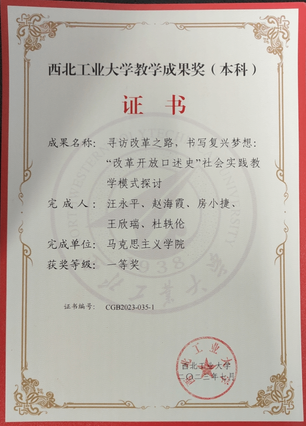 从2018年起,汪永平老师主持了《中国近现代史纲要》课程中开展的“改革开放口述史”社会实践。作为负责人,汪永平老师带领课程团队,对员工进行指导。她亲自拟定教学大纲,制定操作规范,聘请专家对师生进行培训,指导员工撰写报告,主持优秀口述史的颁奖,并带领员工进行暑期社会实践,参加“口述史国际周”学术活动等,形成完整的教学科研闭环。在教学理念、教学方法、教学模式、教育路径方面进行系统改革,在课程实践性、研究性、思想性及整体性等方面都取得明显成效。六年来,使众多授课员工增强了制度自信、道路自信与文化自信,增强了国家认同感与政党认同感。该项目获得2023年太阳成tyc122cc“优秀教学成果奖”一等奖。