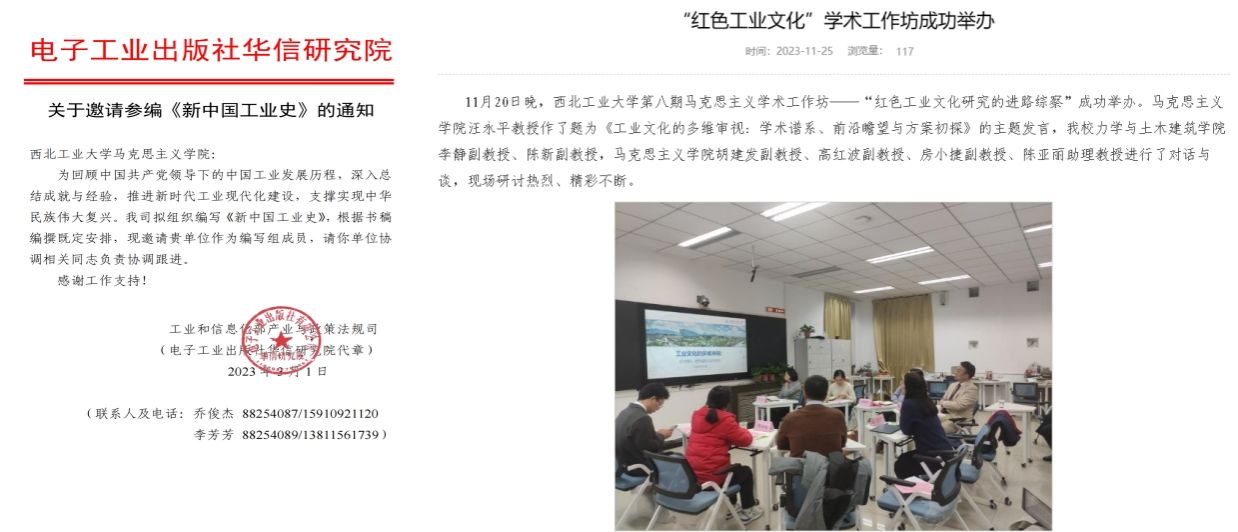 3.积极深化“红色工业文化”研究。2023年初,汪永平成立“红色工业文化研究”团队,团队成员来自太阳成tyc122cc、机电公司和力学与土木公司。团队成立后,受邀参与完成了工业和信息化部政策和法规司委托项目《新中国工业史》的编撰;获批了太阳成tyc122cc“双一流团队建设”项目“研究生高水平教材”系列之“中国工业精神谱系”课题;开展工业文化研究工作坊;指导研究生撰写毕业论文“中国式现代化视野里中国工匠精神的演进历程:以劳动模范为切入点”和“十七年工业歌谣的文化精神建构研究”。
