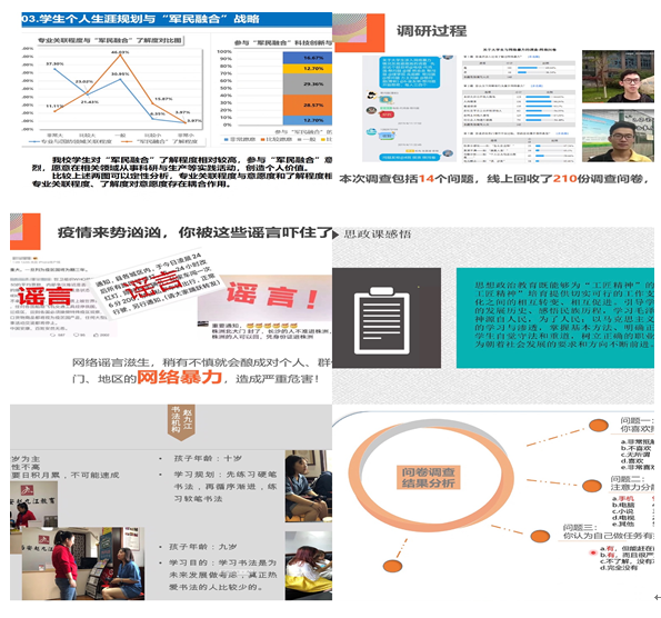 经过初评,在全校同学广泛参与的基础上,共有16个调研团队进入终评。各团队依次进行了成果展示,同学们的社会调查选题新颖,调研数据翔实、态度严谨,表达多样化,并将核心问题与思政课相联系得出结论。在前期调研的基础上,不少团队都结合当前疫情进行问题延申和新的探索,紧密围绕社情民情丰富了调研成果。谈到开展社会调查的体会,不少团队都谈到,这种实践十分必要且能够充分展示劳动教育在思政课中的意义,突出了公司思政课教学改革实践的育人实效。