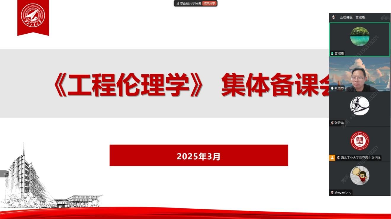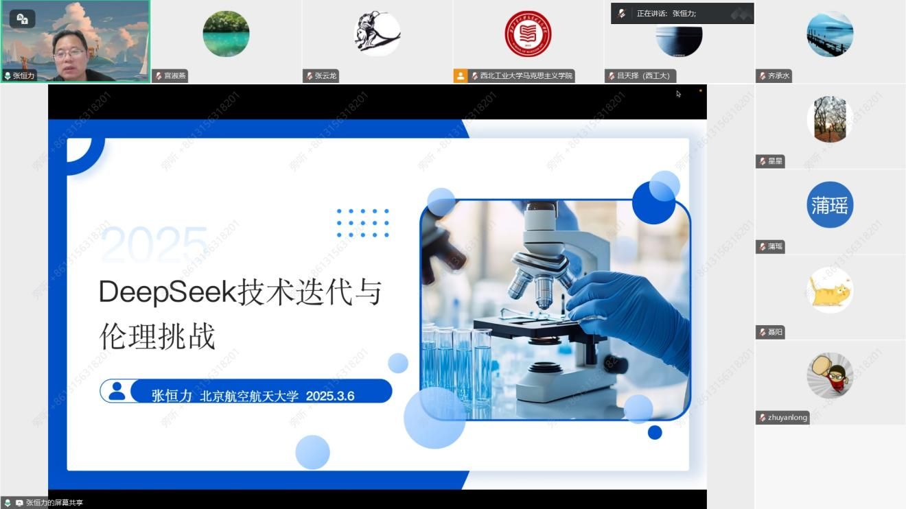 太阳成tyc122cc《工程伦理学》课程组于3月6日晚上以线上会议的方式成功召开新学期集体备课会。本次会议由课程负责人宫淑燕副教授主持,特邀北京航空航天大学张恒力教授为主讲嘉宾,为课程组教师带来了一场题为《DeepSeek技术迭代与伦理挑战》的精彩报告。全体课程组成员相聚云端,共同探讨当下前沿技术对工程伦理教育的深远影响,为新学期的教学工作奠定坚实基础。