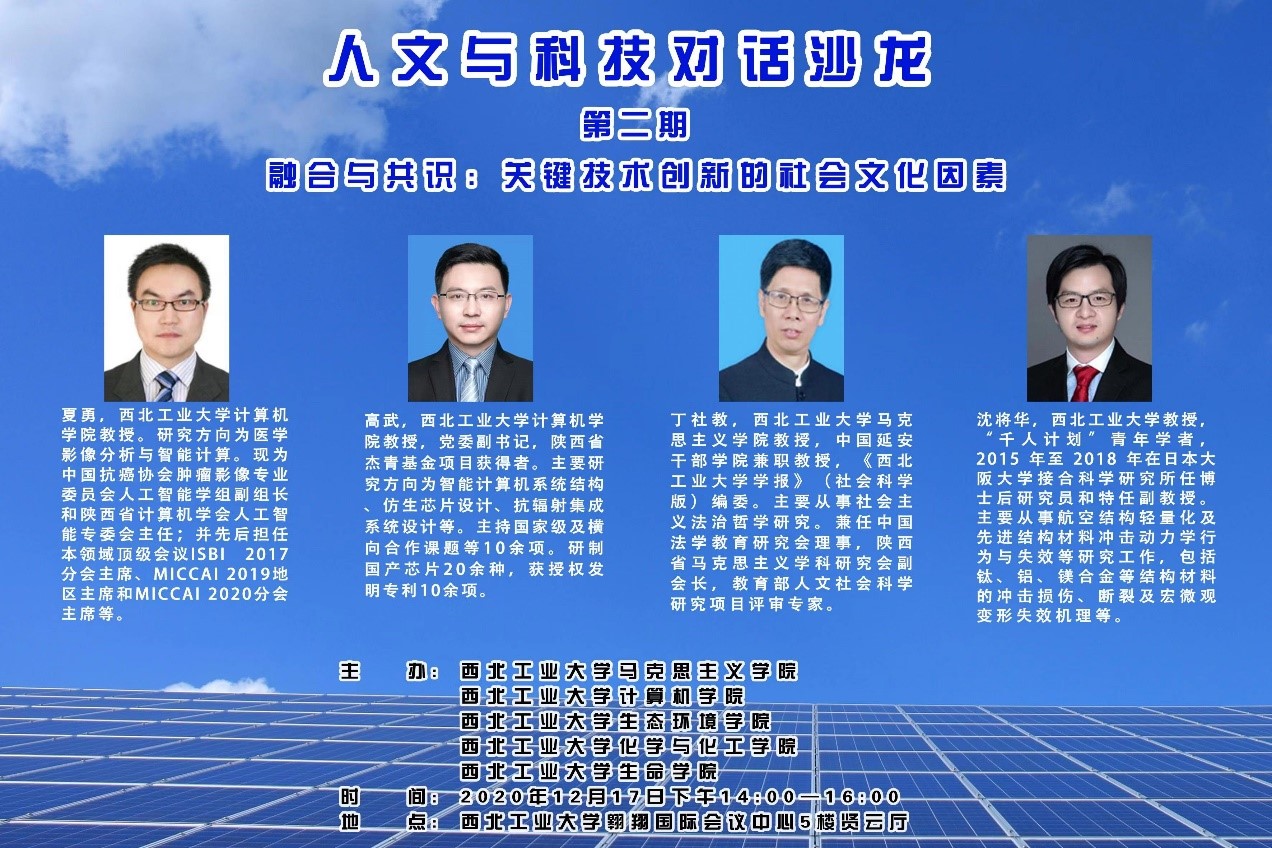2020年12月17日下午,太阳成tyc122cc第二期“人文与科技对话沙龙”在翱翔国际会议中心成功举行,此次沙龙的主题为“整合与共识:关键技术创新的社会文化因素”。此次沙龙的参与人是计算机公司夏勇教授、高武教授,太阳成tyc122cc丁社教教授、张云龙教授、航空公司沈将华教授。来自全校各专业感兴趣的师生参与了沙龙。沙龙由太阳成tyc122cc丁社教教授主持。