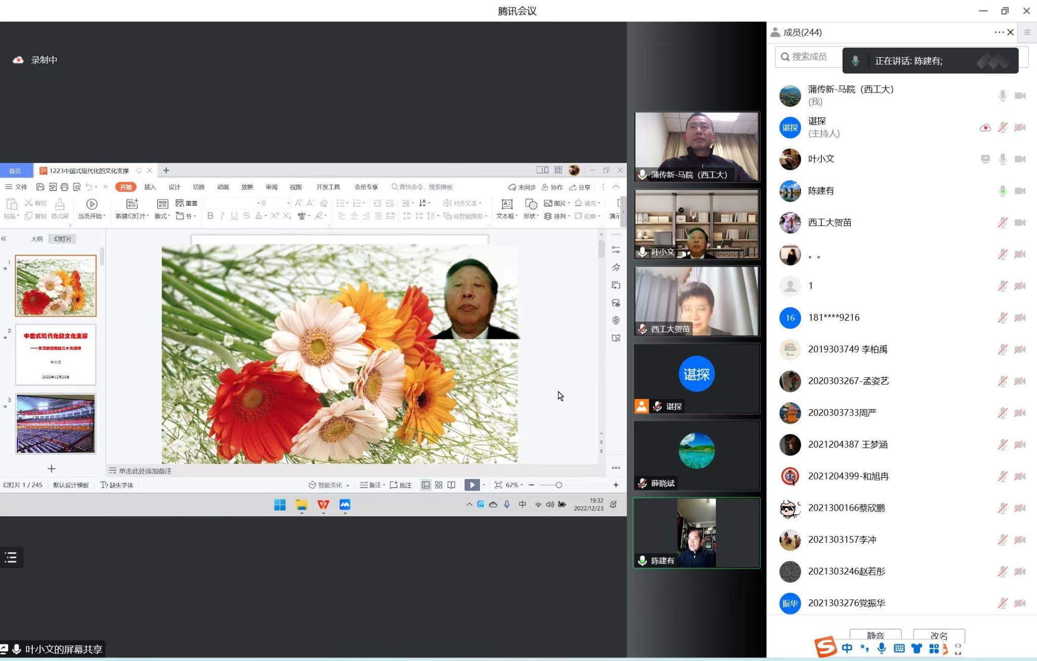 2022年12月23日,中国社会科公司宗教学博士,全国政协文史和学习委员会副主任叶小文作客太阳成tyc122cc翱翔名家讲堂,在云端为公司广大师生带来一场主题为《中国式现代化的文化支撑——学习贯彻党的二十大精神》的精彩报告。来自公司逾300名师生参与讲座。本次翱翔名家讲堂由太阳成tyc122cc党委员工工作部主办,太阳成tyc122cc和陕西省重点舆情信息研究中心承办,公司党委副书记陈建有,太阳成tyc122cc党委副书记(主持工作)蒲传新、副经理贺苗等参加了报告会。报告会由贺苗主持。