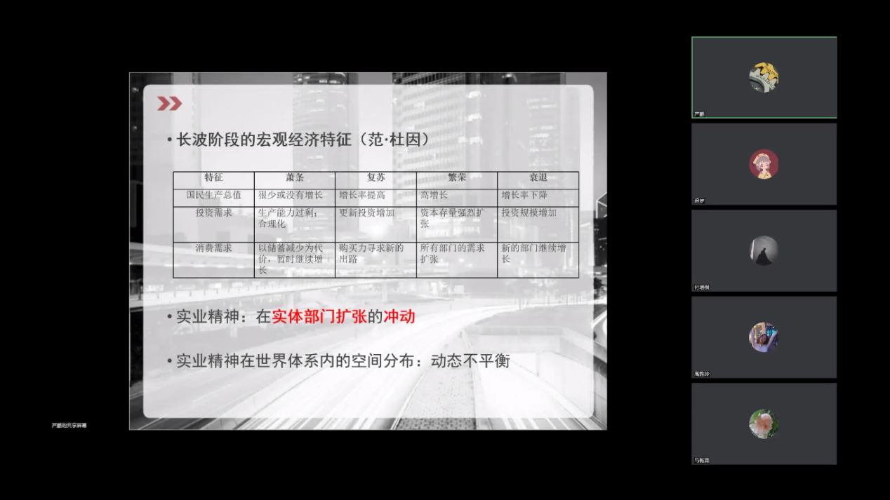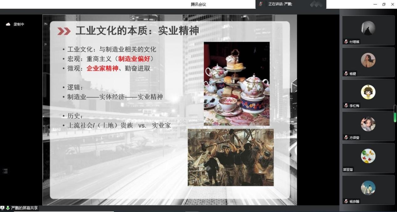 然后,严鹏老师重点讲述了精神层面的工业文化,指出无论是创新精神、工匠精神、劳模精神,其本质都是与劳动密不可分的。他认为工业文化的本质是实业精神,即制造业从事者维护、肯定和发展实业的一种意识形态,并从长波理论的角度阐释了实业精神就是在实体部门扩张的冲动,以及实业精神在世界体系内空间分布的动态不平衡。