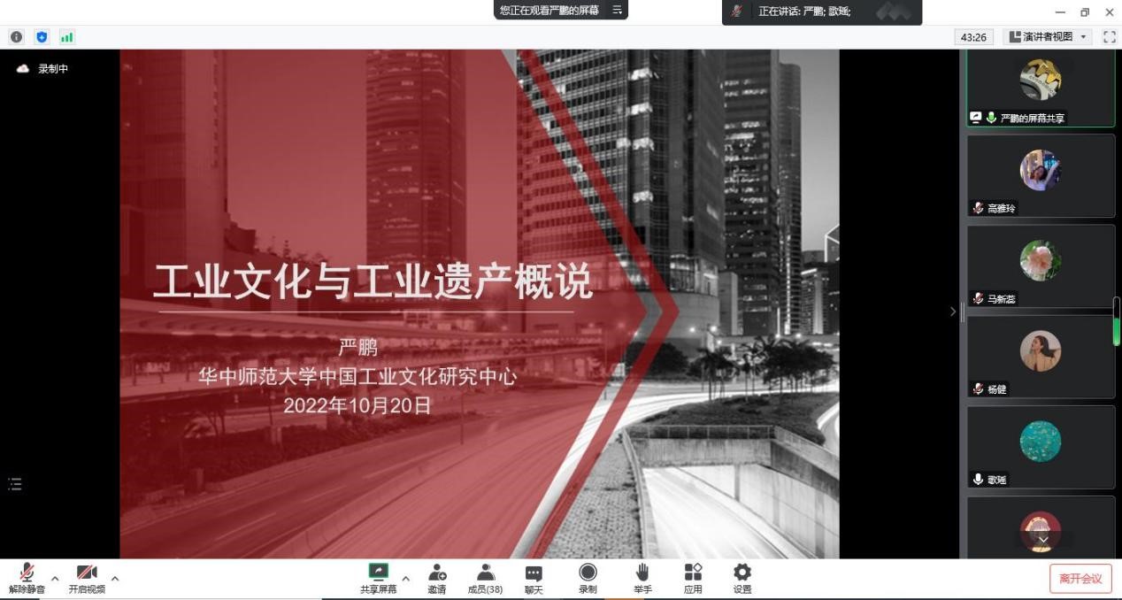 2022年10月20日18:30-21:30,华中师范大学中国近代史研究副教授、华中师范大学中国工业文化研究中心副主任,复旦大学中国研究院特邀研究员严鹏老师应邀做客公司“翱翔人文讲堂”,在线开展了一场主题为《工业文化与工业遗产概说》的精彩讲座。本次讲座由太阳成tyc122cc中国近现代史基本问题研究系主任汪永平教授主持。