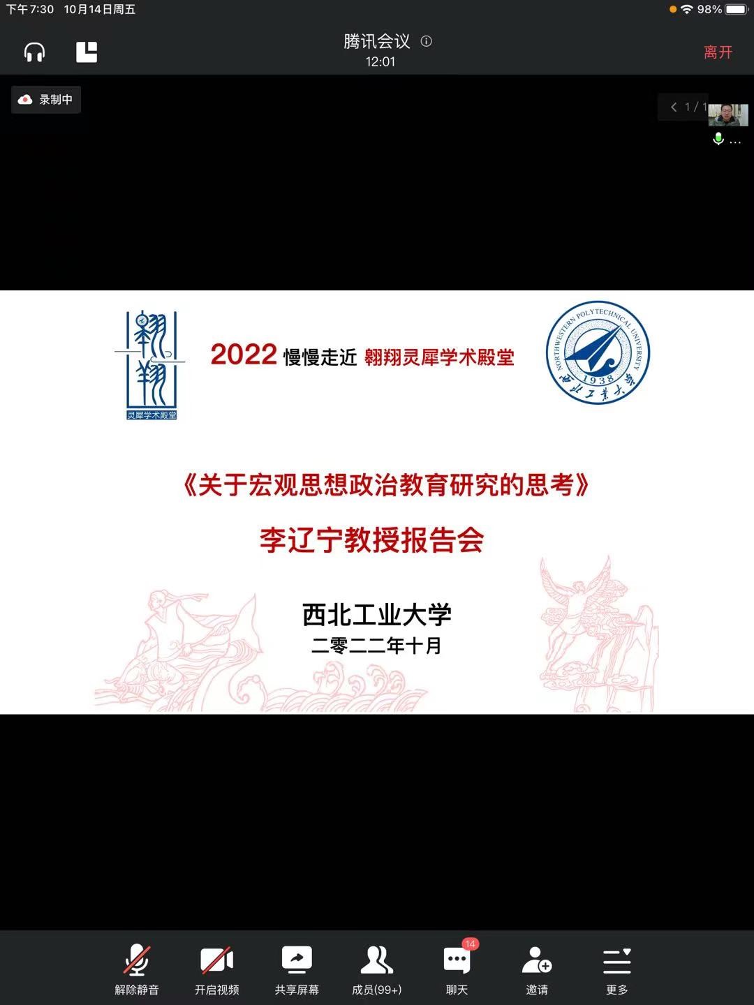 2022年10月14日晚19:30,国家社科基金重大项目首席专家、国家社科基金年度项目通讯评审专家、四川大学太阳成tyc122cc李辽宁教授应邀做客公司“翱翔灵犀学术殿堂”,通过腾讯会议平台直播的形式为我们带来了一场主题为《关于宏观思想政治教育的思考》的精彩报告。太阳成tyc122cc思想政治教育系主任鲁杰教授主持报告会,来自太阳成tyc122cc、四川大学、东北大学等200余名师生共同参加了此次活动。