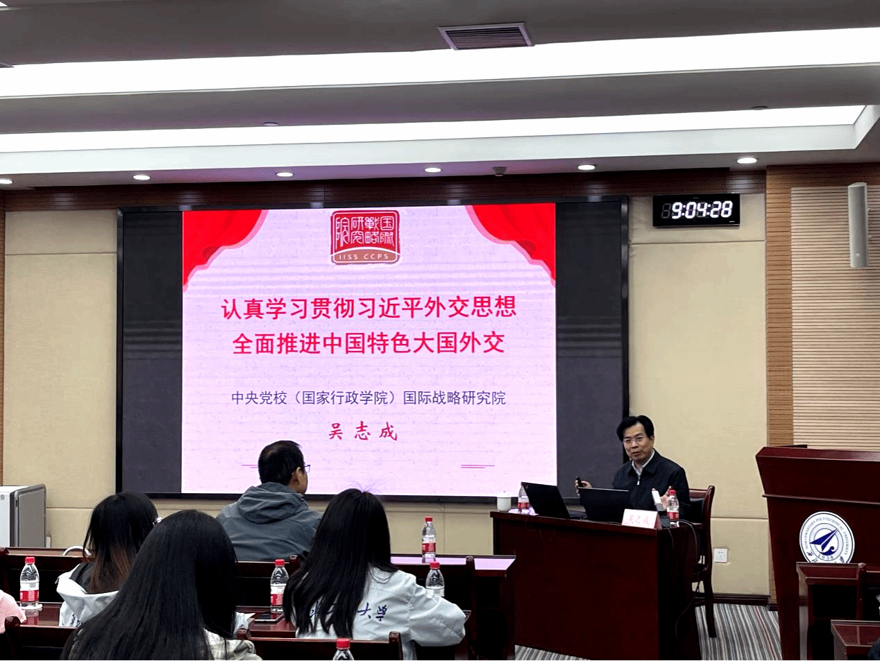 吴志成对公司的热情欢迎和周密安排表示由衷感谢。会上,吴志成作《认真学习贯彻习近平外交思想 全面推进中国特色大国外交》主题演讲,从“是什么、为什么、怎么做”三个方面深入解读了如何准确理解习近平外交思想的科学内涵、如何深刻把握习近平外交思想产生的时代背景、如何全面推进中国特色大国外交的战略实践。