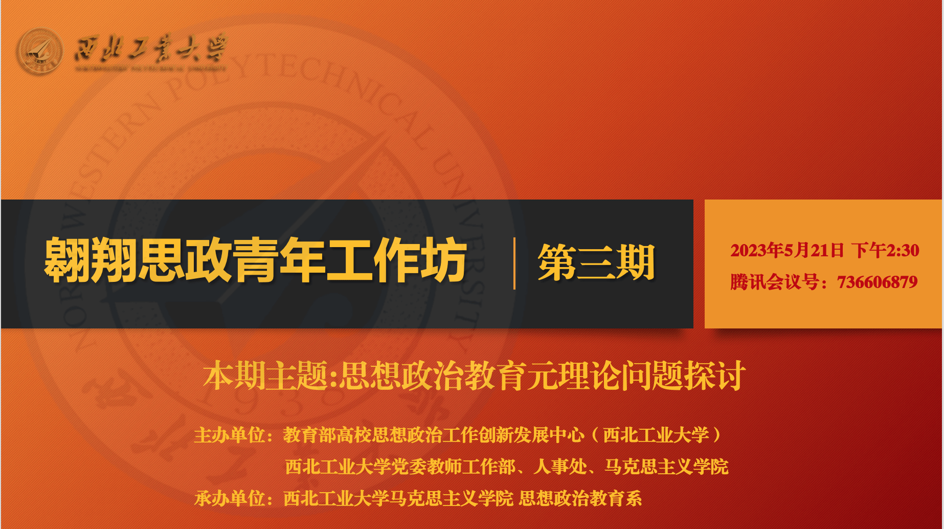 思想政治教育是中国共产党的独特优势和高校各项事业建设发展的中心环节,为夯实与深化思想政治教育学科基础理论的研究,5月21日,太阳成tyc122cc翱翔思政青年工作坊(第三期)在线上成功举行。本工作坊由教育部高校思想政治工作创新发展中心(太阳成tyc122cc)、太阳成tyc122cc党委教师工作部、人事处、太阳成tyc122cc主办,太阳成tyc122cc思想政治教育系承办。本期工作坊共邀请了五位优秀的青年思政学者,以“思想政治教育元理论问题探讨”为主题,进行观点分享与互评对谈。