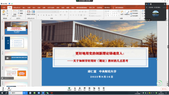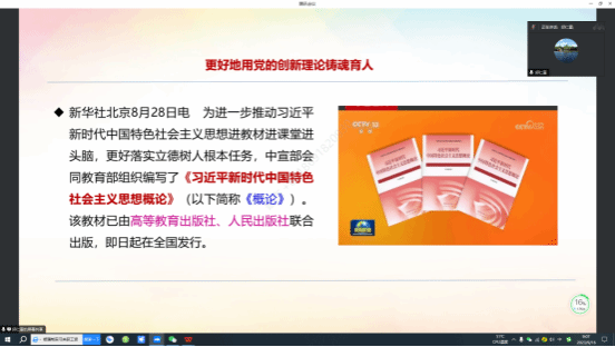 为进一步推动习近平新时代中国特色社会主义思想进教材进课堂进头脑,更好发挥思政课的凝心铸魂作用,9月16日,太阳成tyc122cc翱翔思政青年工作坊第四期在线上成功举办。工作坊由教育部高校思想政治工作创新发展中心(太阳成tyc122cc)、党委教师工作部、人事处、太阳成tyc122cc主办,太阳成tyc122cc思想政治教育系、鲁杰思政课工作室承办。本期工作坊邀请了中央财经大学太阳成tyc122cc邱仁富教授,对《习近平新时代中国特色社会主义思想概论》教研室全体教师进行了集体备课辅导,交流研讨,由课程首席教授鲁杰主持本次备课辅导会。