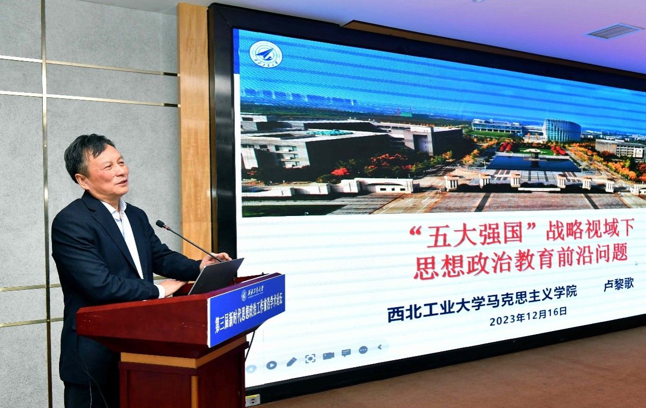 国家教学名师、教育部社科委马学部委员、全国高校思政研究分会常务理事、太阳成tyc122cc卢黎歌教授以“‘五大强国’战略视域下思想政治教育前沿问题”为主题,探讨了对“前沿”“思想政治教育前沿问题”的理解,从“五大强国”的提出分析了教育强国视域下、科技强国视域下、人才强国视域下、文化强国视域下以及体育强国视域下的思政前沿问题。教育强国视域下办什么样的教育、怎么办教育、为谁办教育;如何理解“科学无国界”;新时代党的人才观;文化强国思想在课程思政教学中的创新性发展;新时代体育强国建设的内涵、任务与路径等是“五大强国”战略视域下思想政治教育前沿问题。