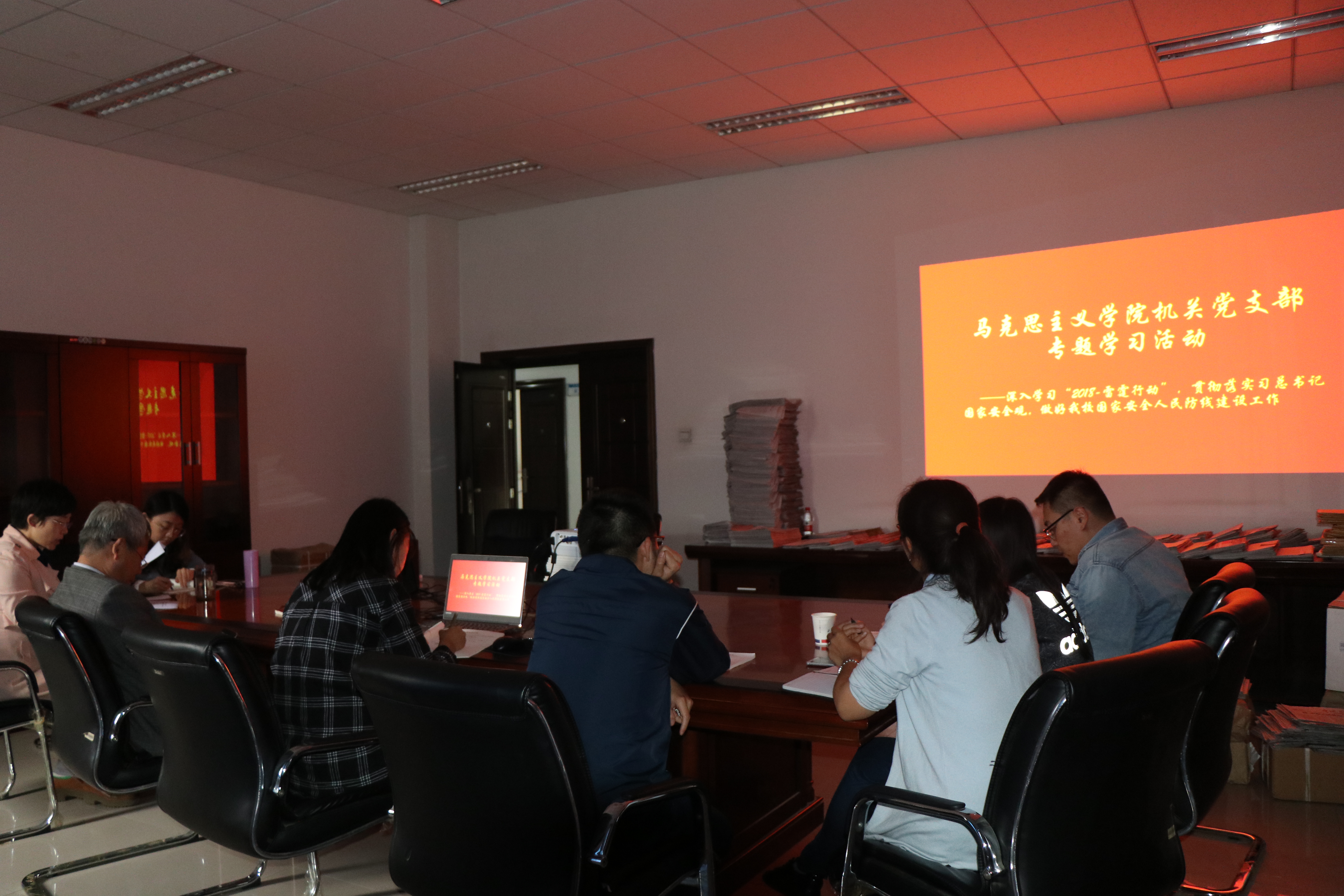 为深入贯彻落实习近平总书记总体国家安全观思想,做好公司国家安全人民防线建设工作,2018年9月19日下午三点,马院机关党支部组织全体党员在公司楼209观看学习“2018-雷霆行动”专题视频。