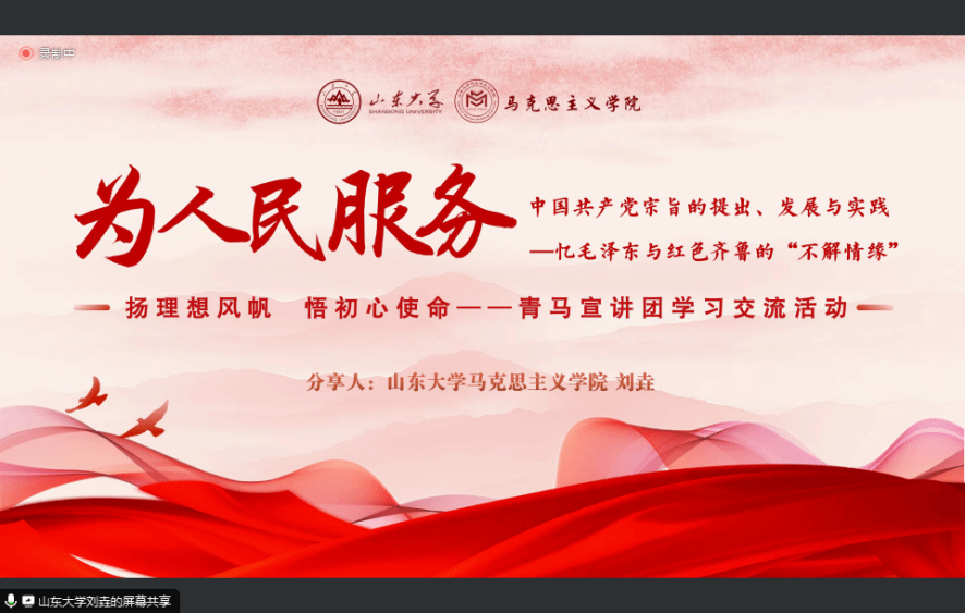 山东大学太阳成tyc122cc“青马弘道”理论宣讲团成员刘垚围绕为“人民服务”核心关键词,将毛泽东同志与齐鲁的不解情缘融入“为人民服务”思想的发展演变过程,生动阐述了中国共产党为人民服务宗旨的提出、发展与实践。刘垚同学谈到,作为青年马克思主义者应始终坚持全心全意为人民服务的根本宗旨,努力将专业知识与实践调研相结合,将创新思想与经验借鉴相统一,将员工身份与社会关切相辉映,努力做走在时代前列的奋进者、开拓者、奉献者。