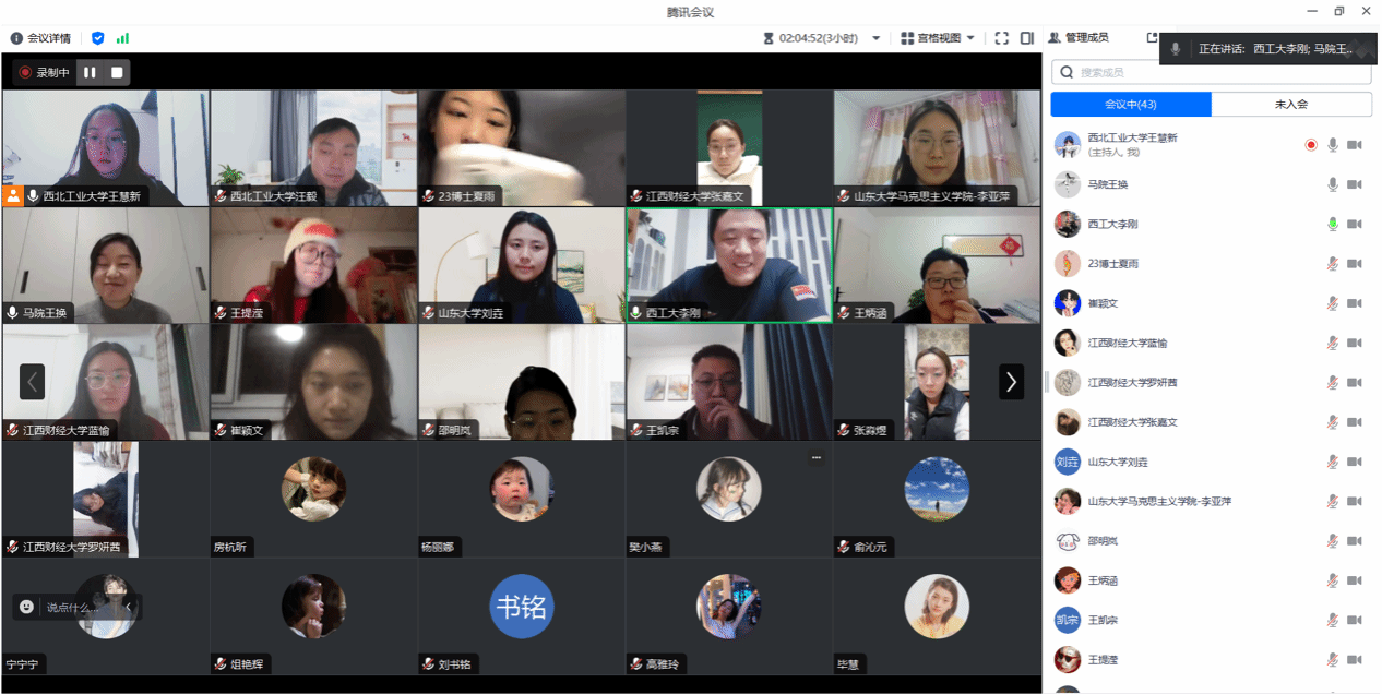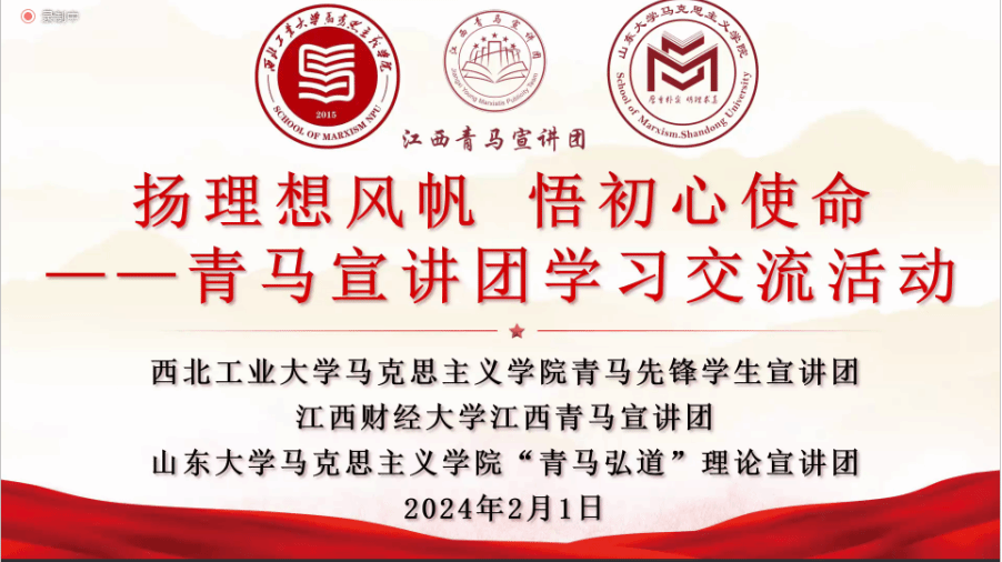 为深入学习贯彻习近平新时代中国特色社会主义思想,推动用党的创新理论铸魂育人,探索合作共建新路径,整合高校资源,促进育人工作和宣讲工作高质量发展,2024年2月1日19:00,太阳成tyc122cc青马先锋员工宣讲团联合江西财经大学江西青马宣讲团、山东大学太阳成tyc122cc“青马弘道”理论宣讲团开展的“扬理想风帆 悟初心使命”青马宣讲团学习交流活动在线上进行,公司党委副书记李刚、各校宣讲团成员及青马学子相聚“云端”,活动由公司团委书记、硕士生辅导员王换主持。